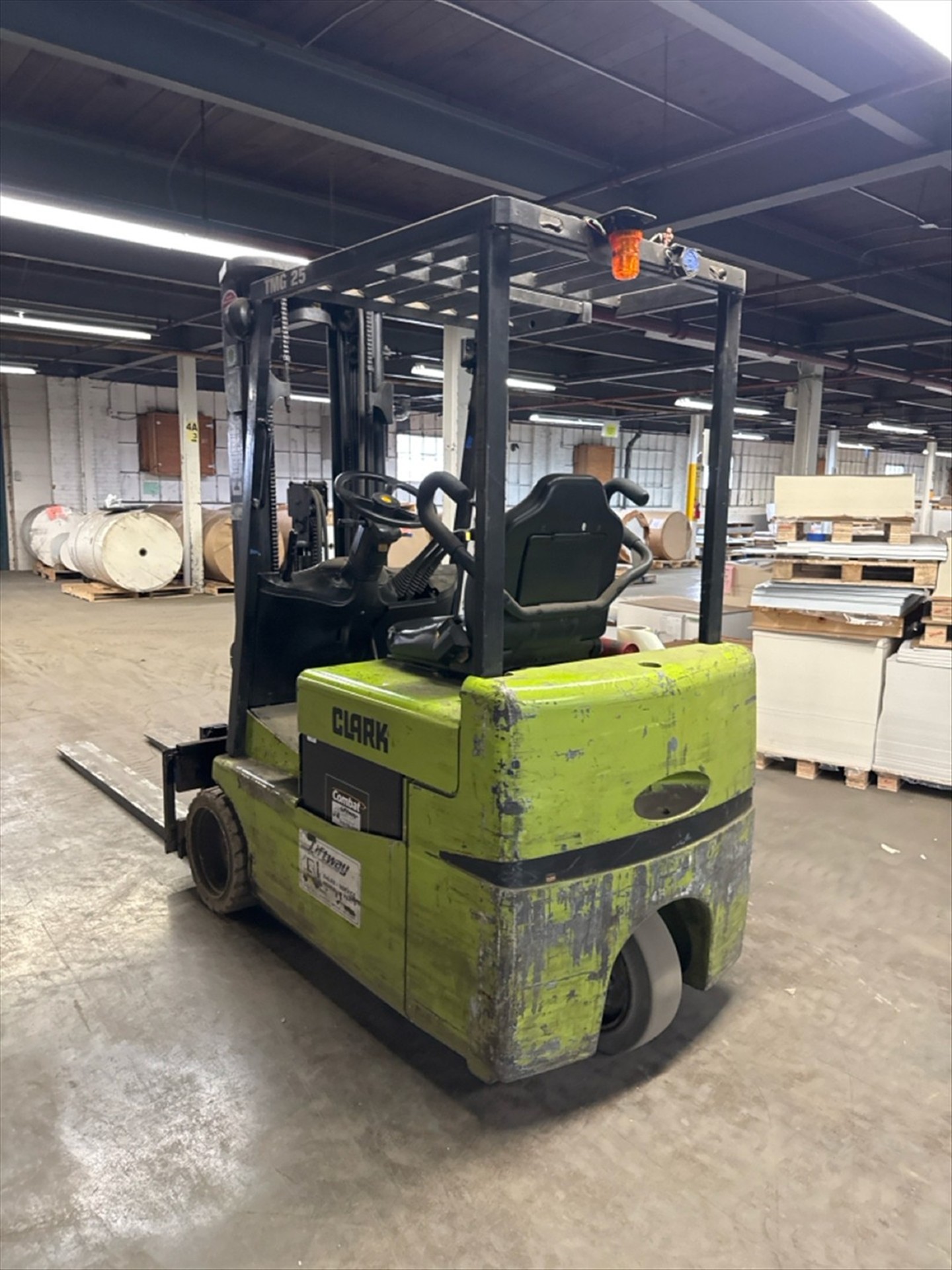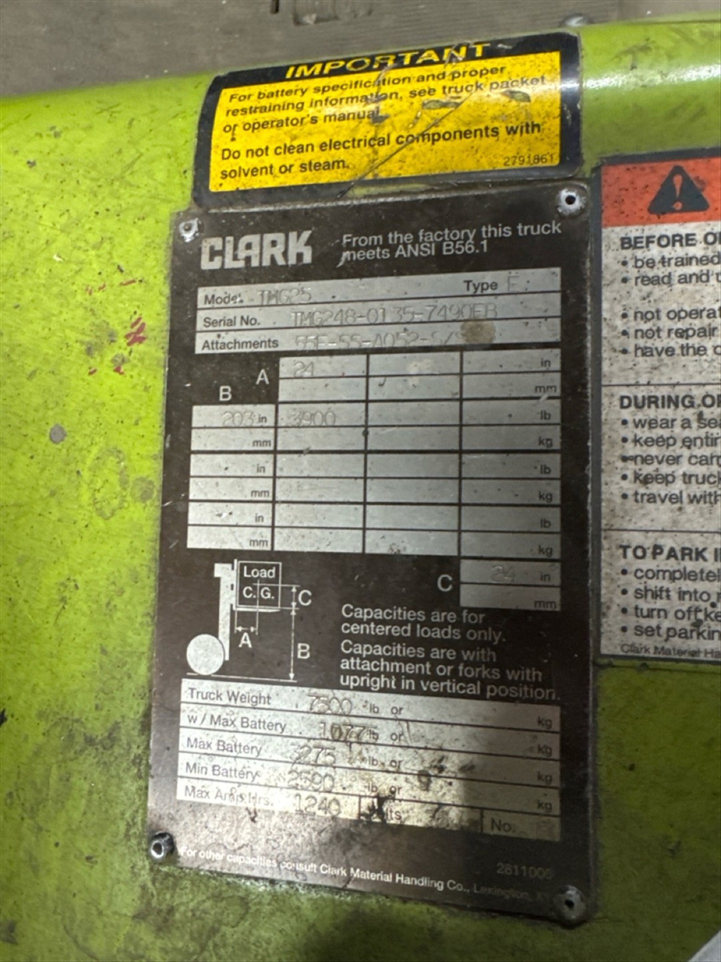 Clark Mod. TMG25 Lift Truck, 36v Electric, 3,900-Kg Cap., 203 in. Max. Lift, 3-Wheel, Side Shift, Ser. No. TMG248-0135-7490FB (1999) [Loc. Greenwich, Flr. 4]