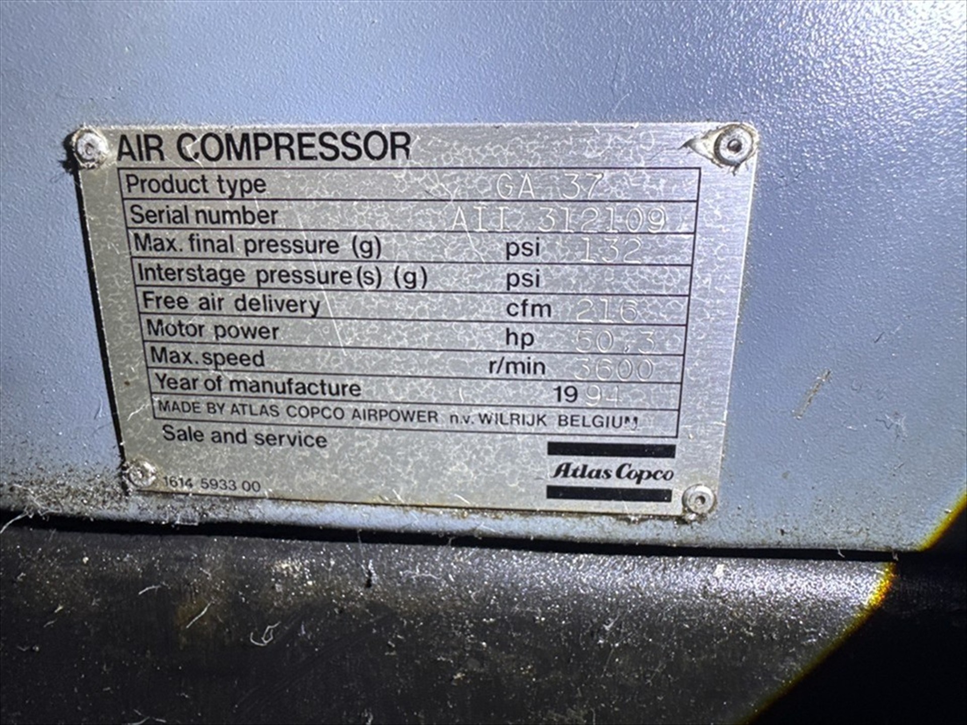 Atlas Copco Mod. Ga37 Rotary Screw Air Compressor, 50-Hp, 132-Psi, Ser. No. Aii312109 (1994) [Loc. Greenwich, Flr. 1]