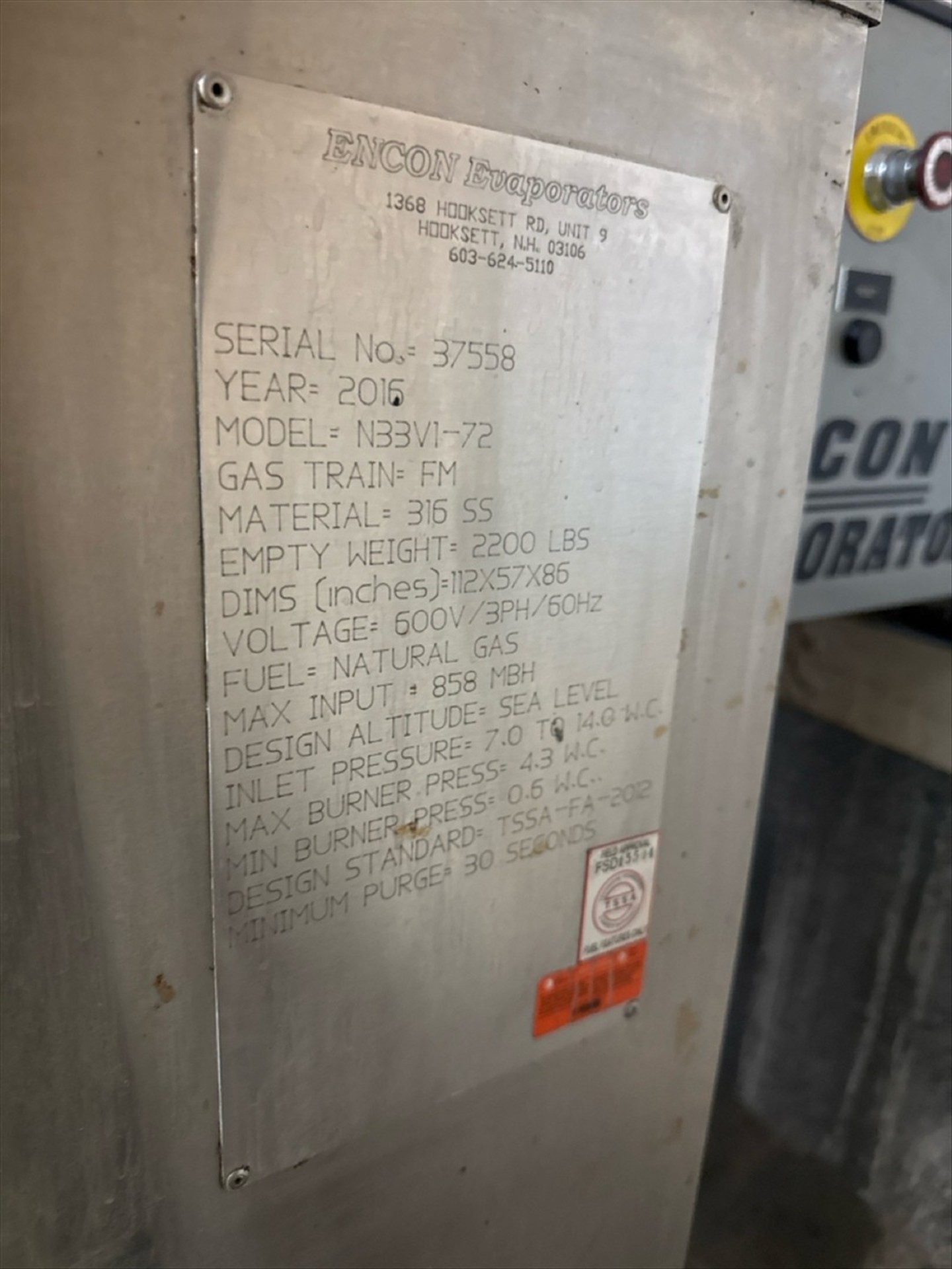 Encon Mod. N33V1-72 Evaporator, Water, Natural Gas, Ser. No. 37558, with Spare Parts which may include heat exchangers, burners, flanges, gaskets, ultrasonice sensors, and heat probe (2006) (Subject to Confirmation) [Loc. Greenwich, Flr. 2]