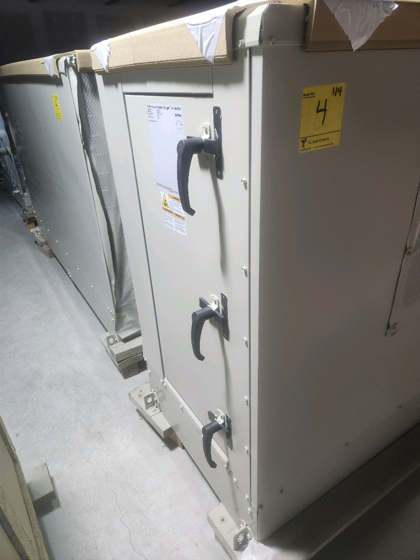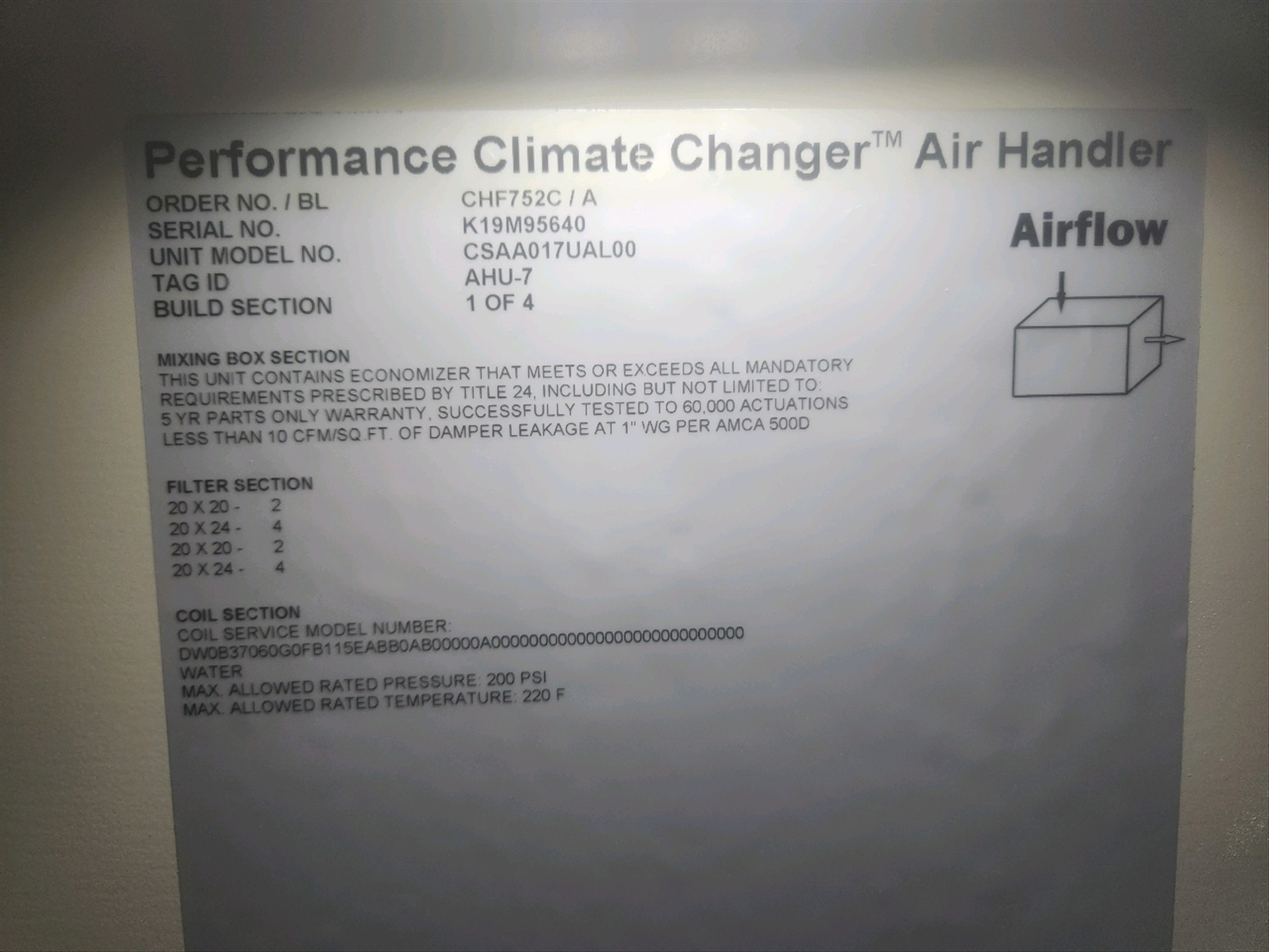 Trane Performance Climate Changer Air Handler, mod. CSAA017UAL00, ser. no. K19M95640, (4) build sections, tag id. AHU-7 (new, never installed)
