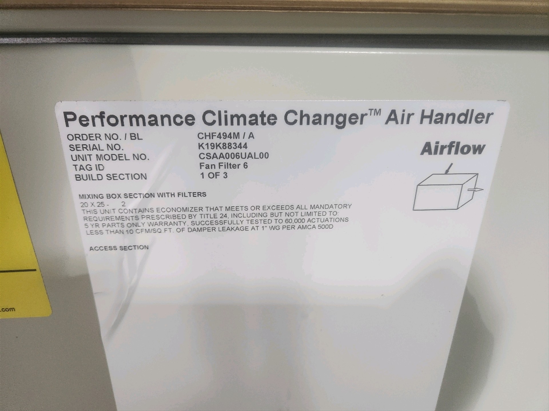 Trane Performance Climate Changer Air Handler Fan Filter, mod. CSAA006UAL00, ser. no. K19K88344, (3) build sections, tag id. Fan Filter 6 (new,never installed)