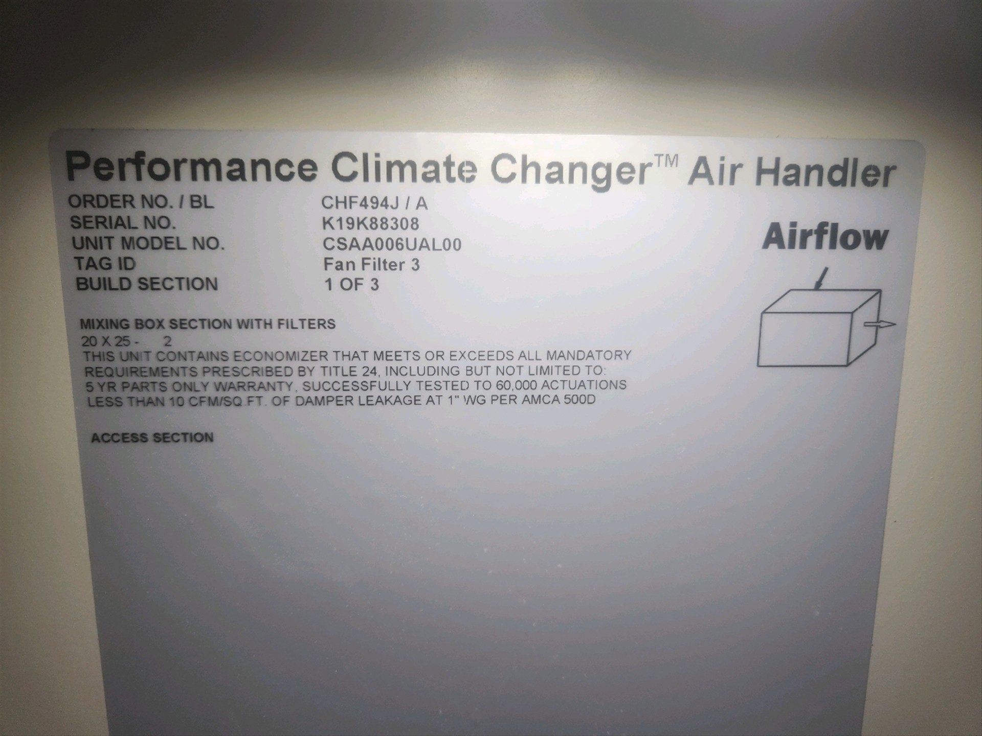 Trane Performance Climate Changer Air Handler, Fan Filter, mod. CSAA006UAL00, ser. no. K19K88308, (3) build sections, tag id. Fan Filter 3 (new, never installed)