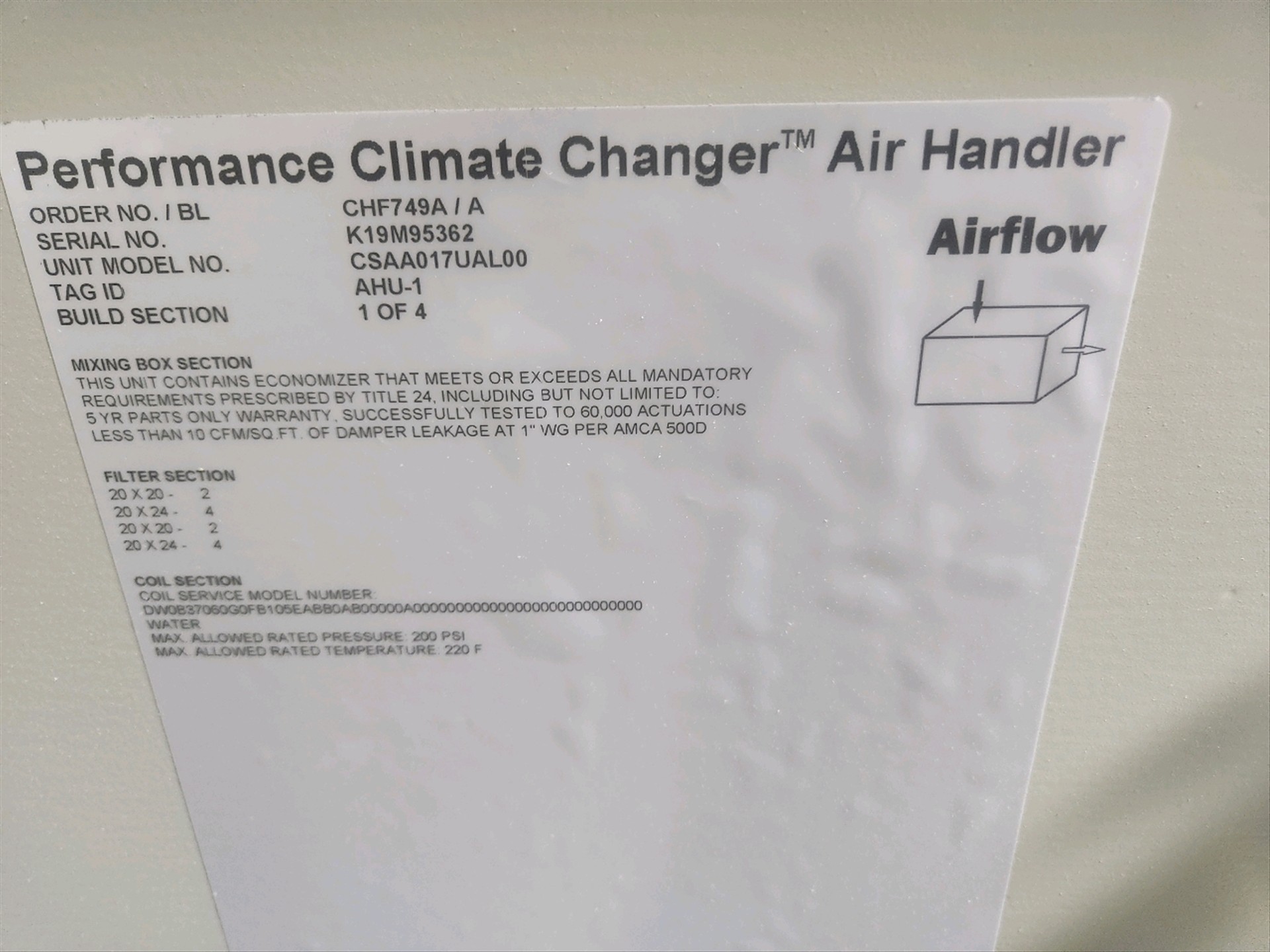 Trane Performance Climate Changer Air Handler, mod. CSAA017UAL00, ser. no. K19M95362, (4) build sections, tag id. AHU-1 (New)