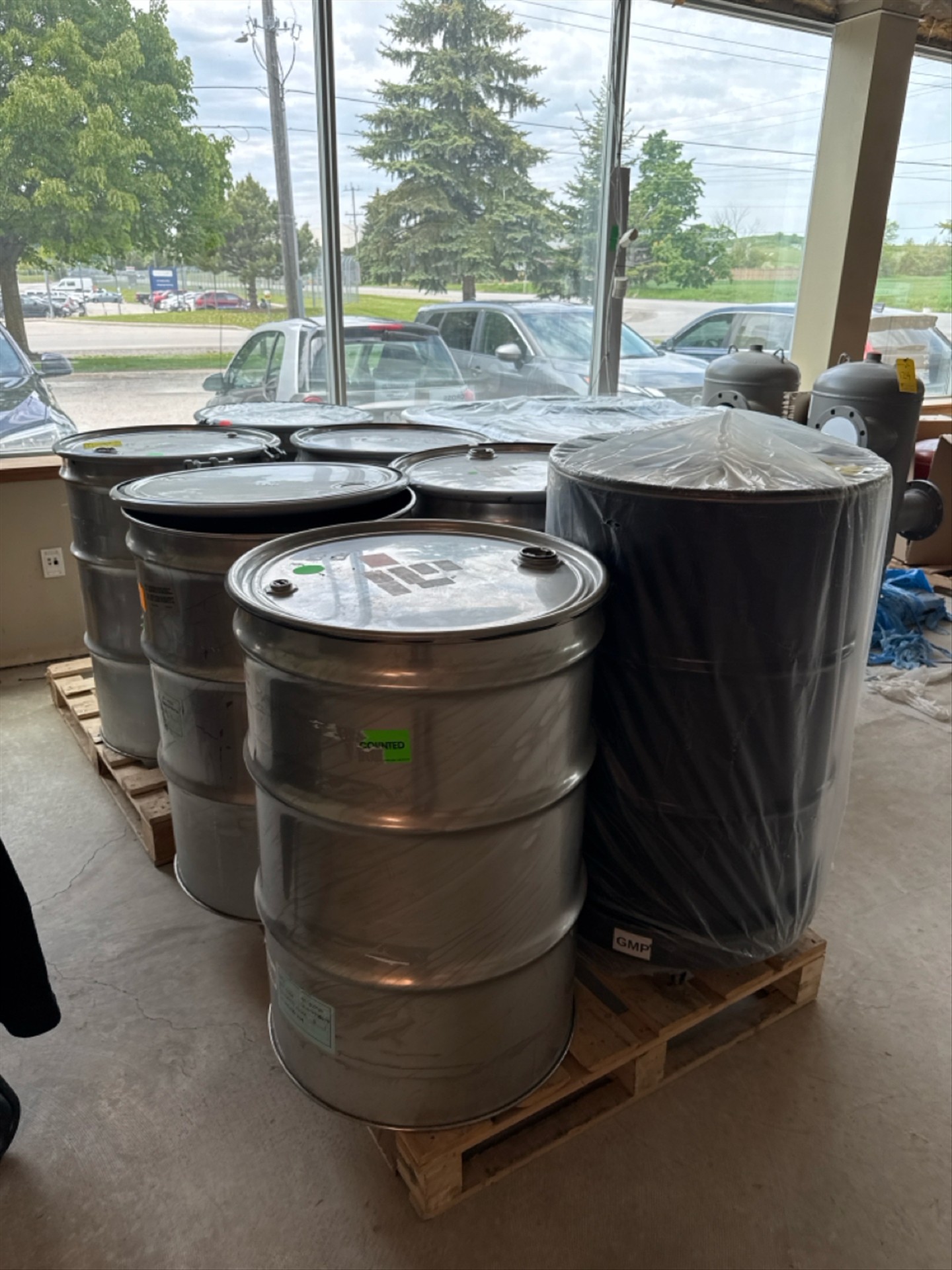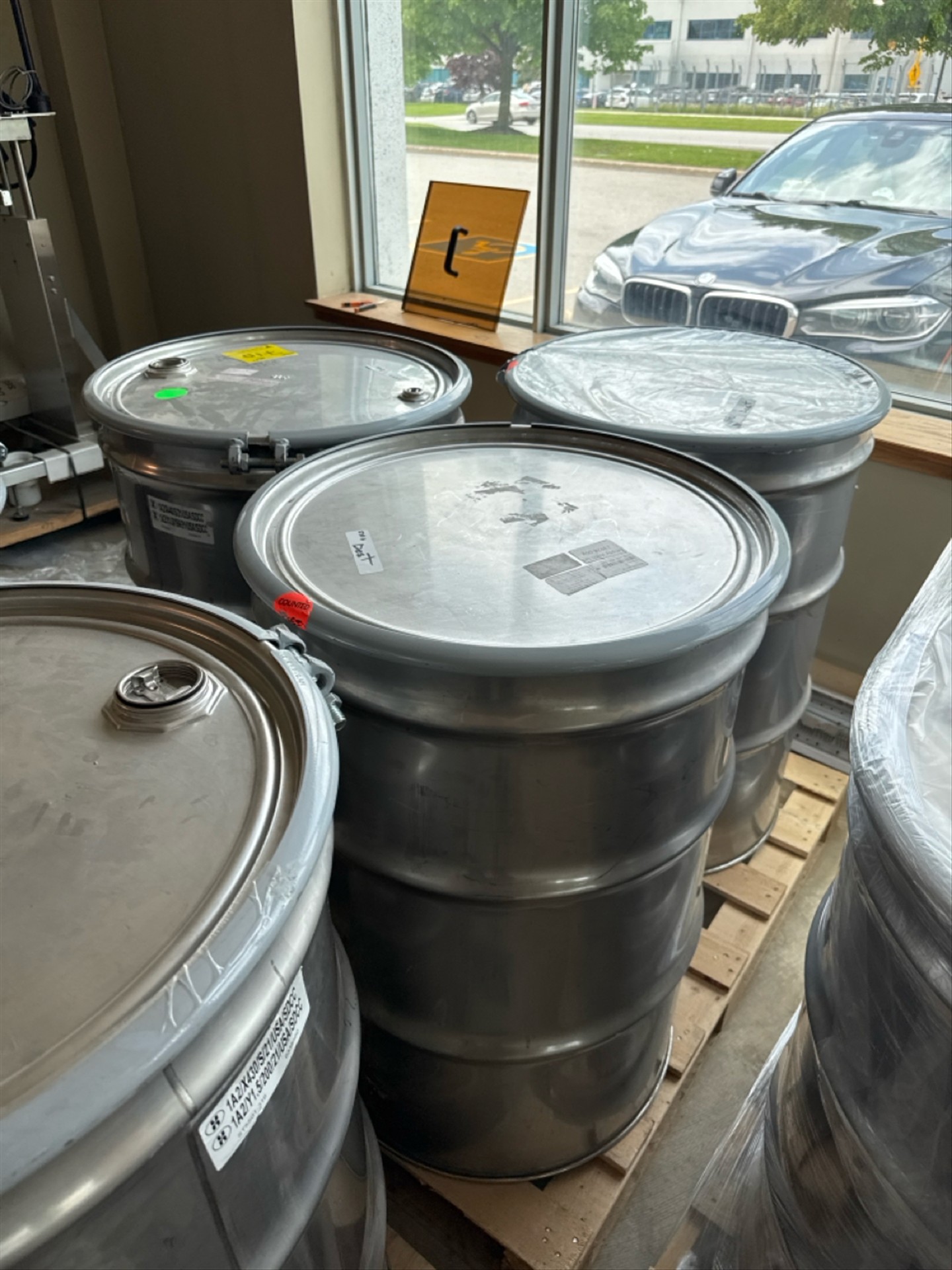 (10) stainless steel 55 gal. drums and (1) steel 55 gal. drum (New)