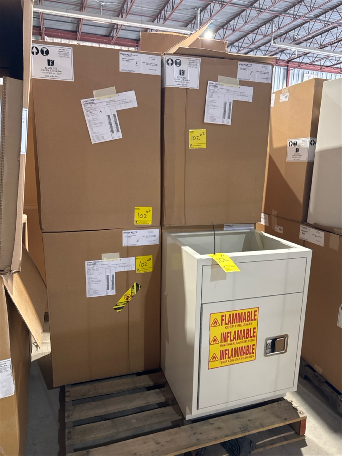 (4) VWR lab cabinet SLV flammables base units, mod. CFE-2684-L, Inset stand HT flam LQD unit/match WD (New)