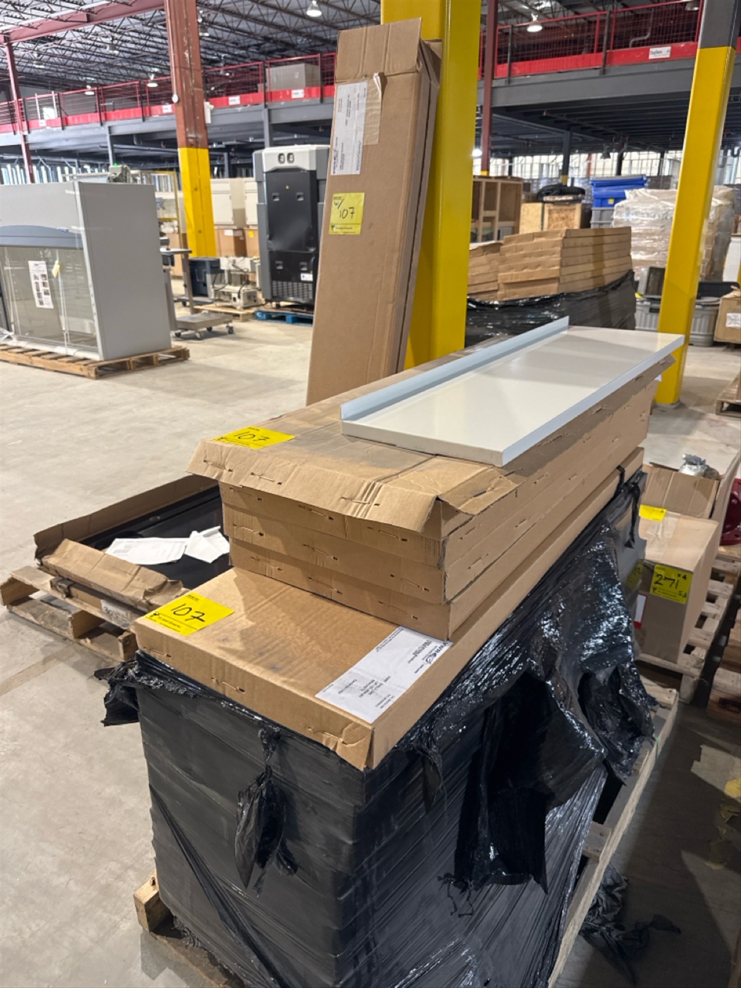 (12) VWR shelves, mod. IL1248, one lip, 12 in. D x 48 in. W, no brackets w/ (4) VWR shelves, mod. IL1242, one lip, 20 in. D x 42 in. W, no brackets w/ (1) VWR cross braces, mod. CB66, w/ MNT hardware (New)