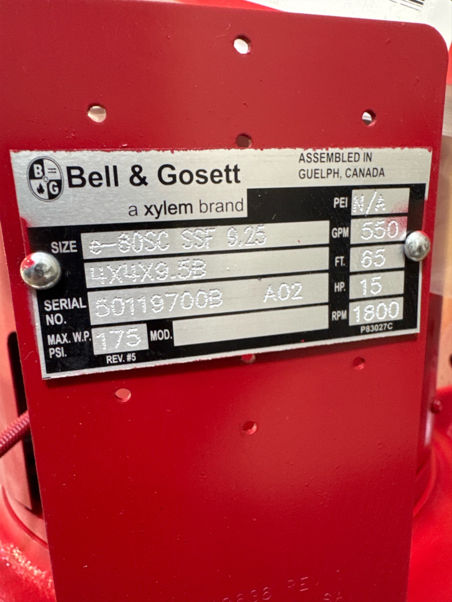 Bell & Gossett Centrifugal Pump, e-80SC Series, mod. 4X4X9.5B, ser. no. 50119700B A02, 15 hp, 1800 rpm, 575 volts, 3 phase, 60 Hz (New, never installed)