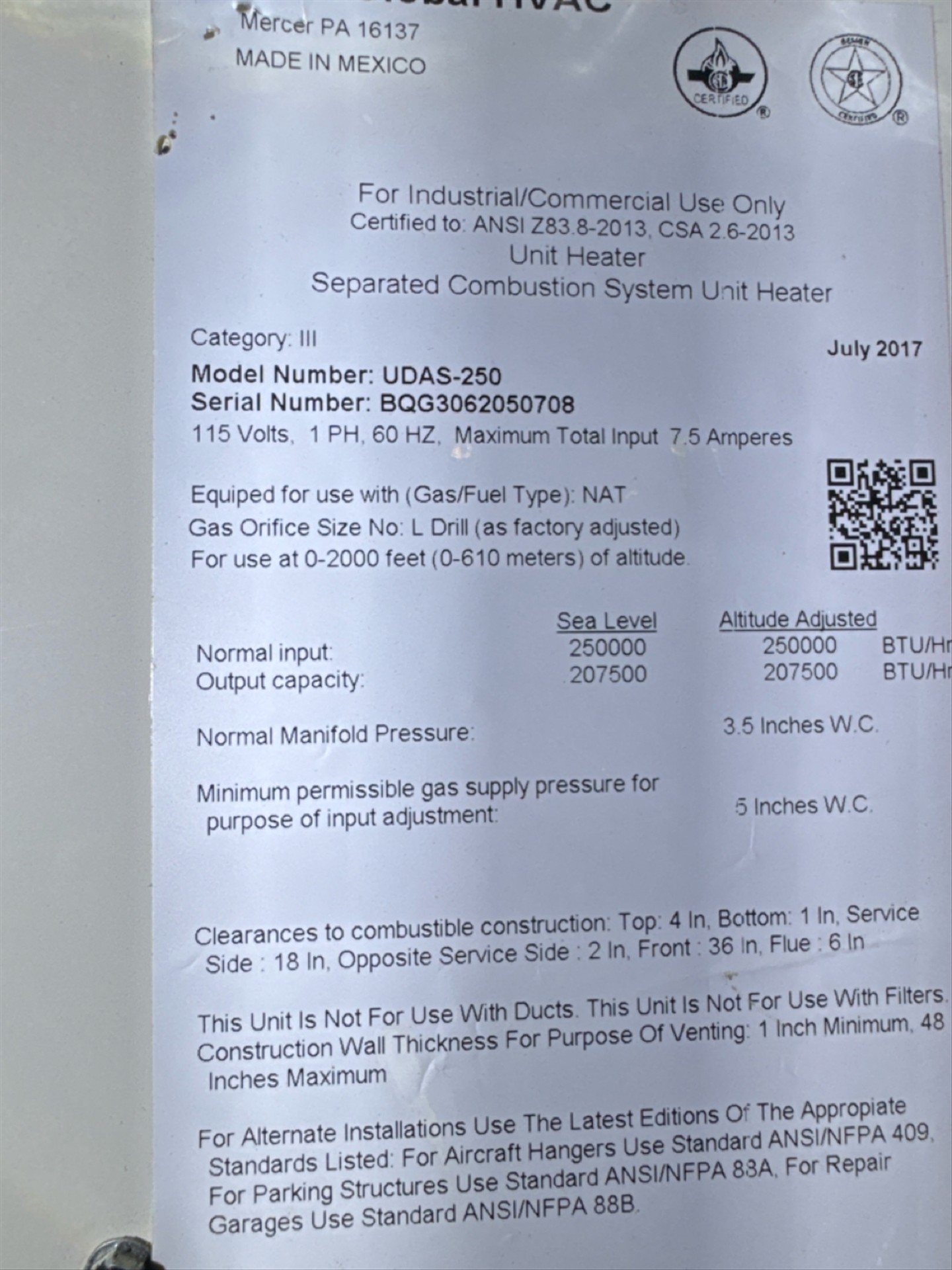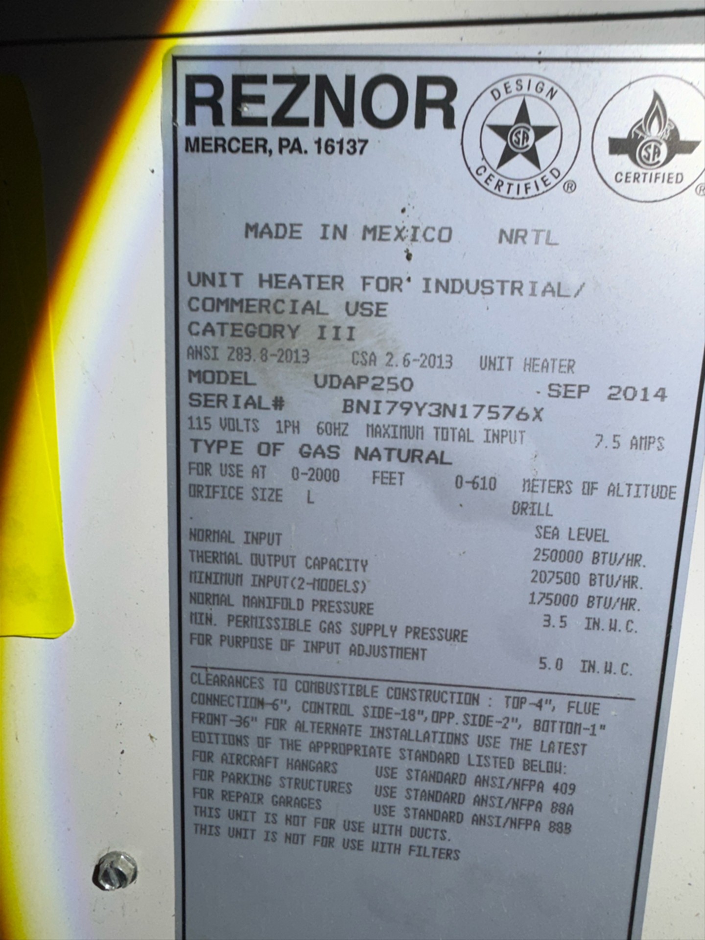 (3) Reznor Unit Heater, mod. UDAP250, 7.5A