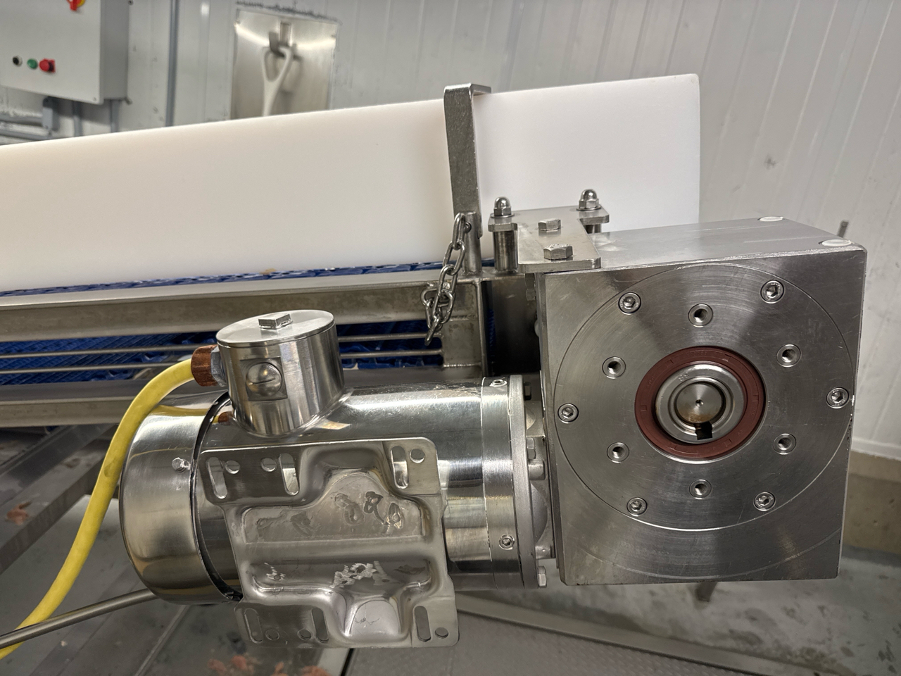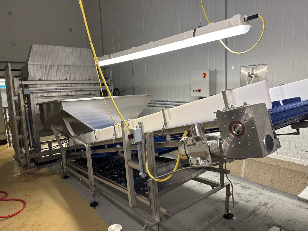 inclined fluted-belt conveyor, approx. 30 in. x 13 ft. w/ hopper, stainless steel, washdown [Loc. Massage]