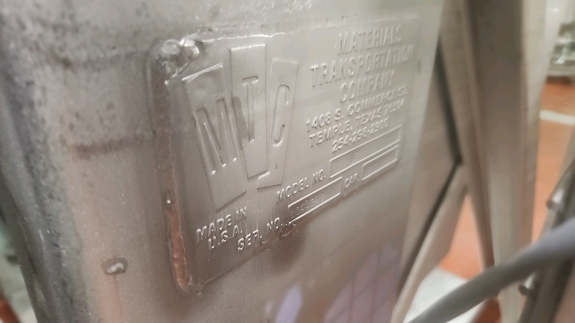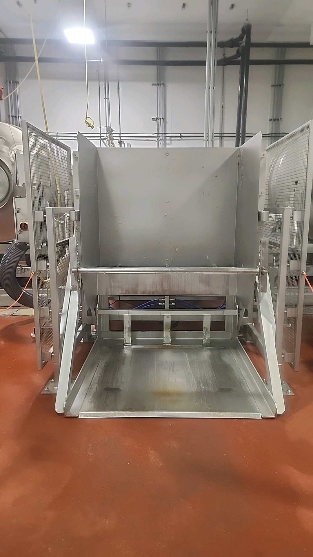 MTC industrial pivot dumper, mod. LP, ser. no. 2040248, stainless steel, 3000 lbs cap., approx. 48 in. x 58 in. x 68 in. lift height c/w hydraulic pack and safety fencing [Loc. Massage]