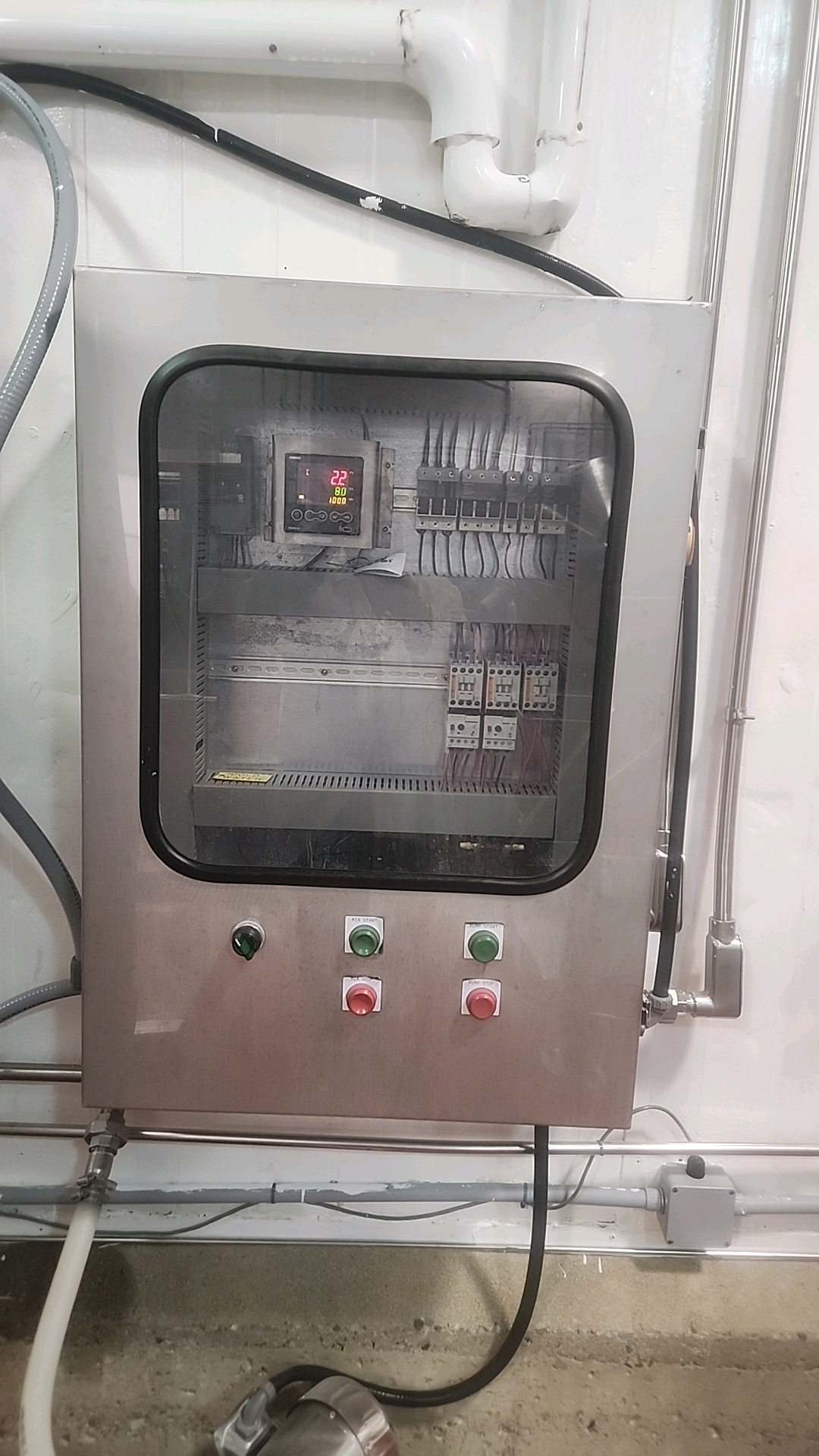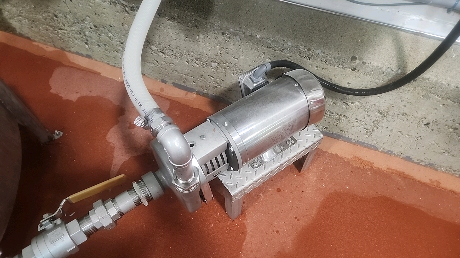 chilled water tank, stainless steel, approx.. 52 in. dia. X 78 in. w/ 1/2 hp washdown mixer, 5 hp washdown centrifugal pump c/w control panel [Loc. Massage]