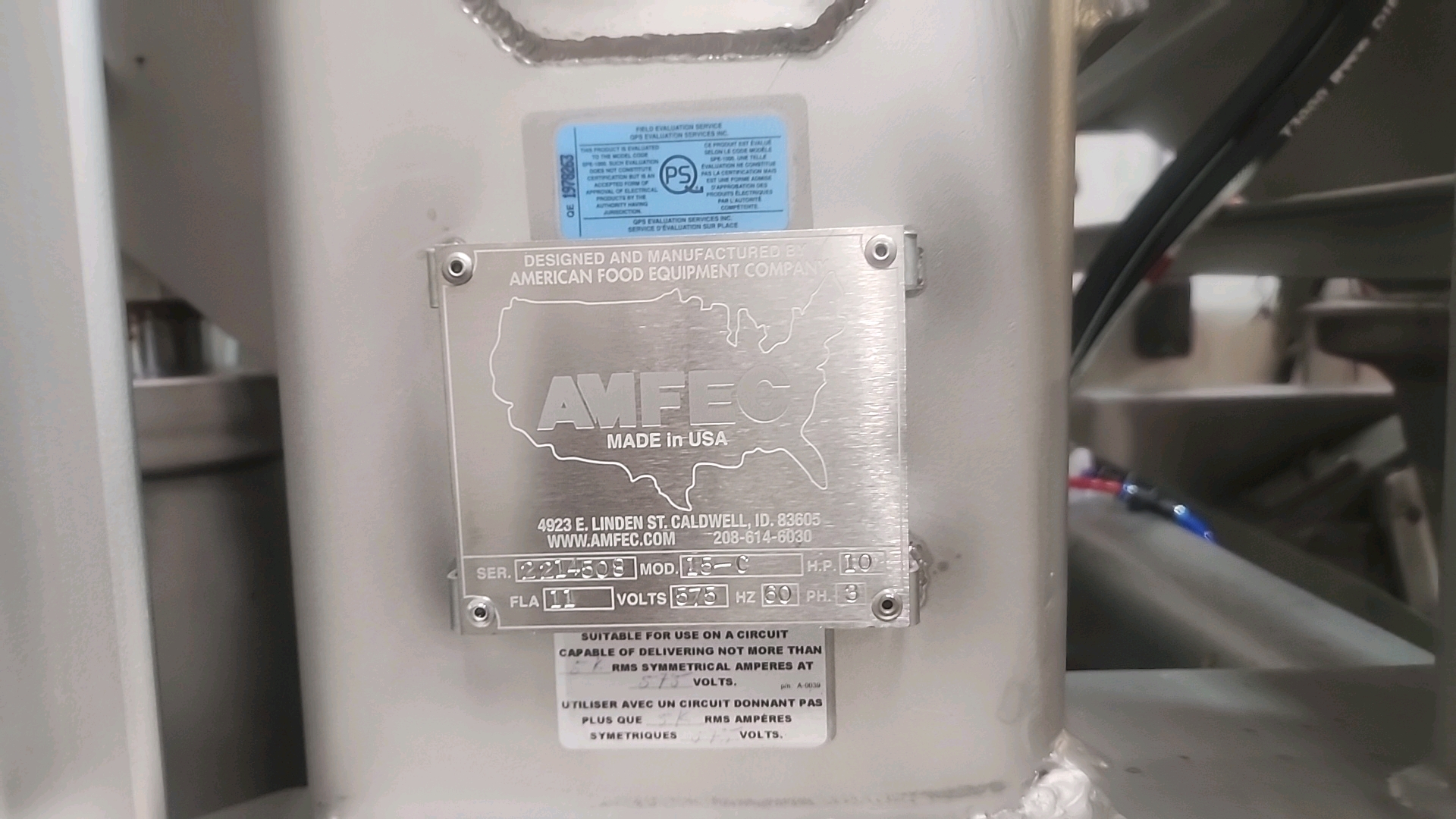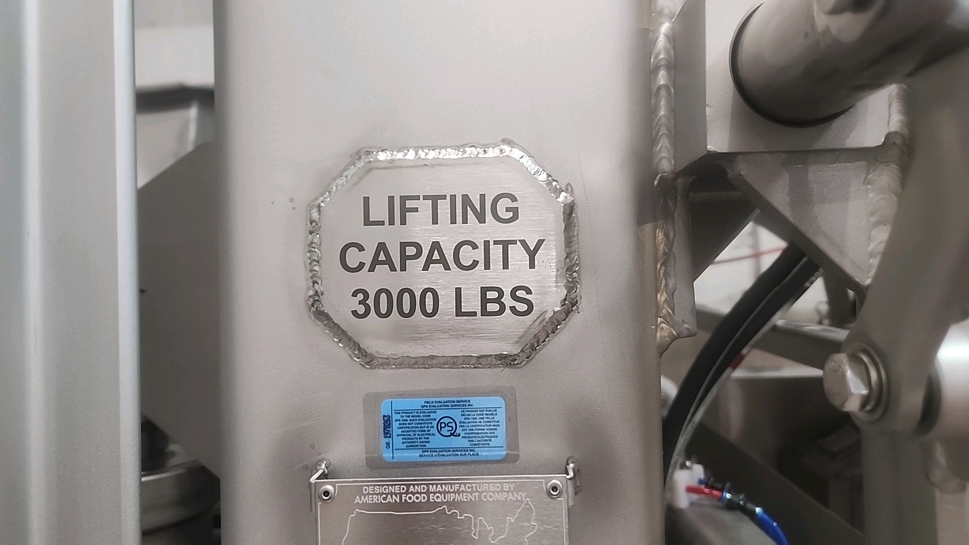 AMFEC industrial lift and pivot dumper, mod. 15-C, ser. no. 2214508, stainless steel, 3000 lbs cap., approx. 48 in. x 58 in. x 68 in. lift height c/w hydraulic pack and safety fencing [Loc. Massage]