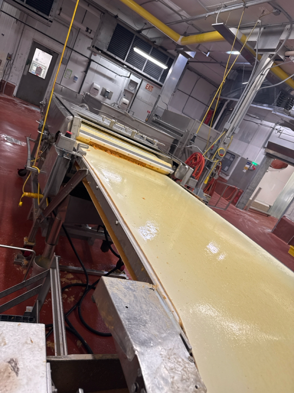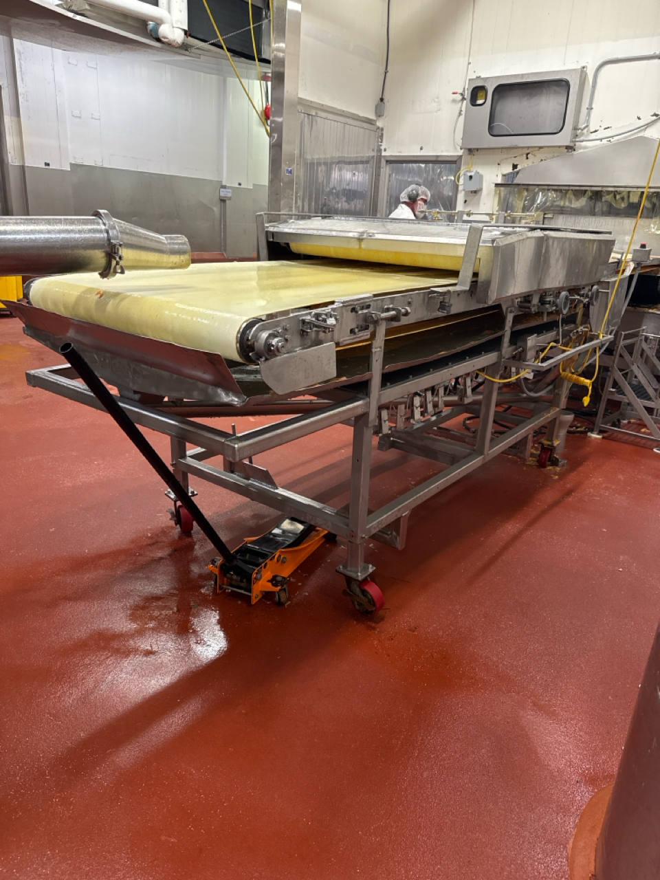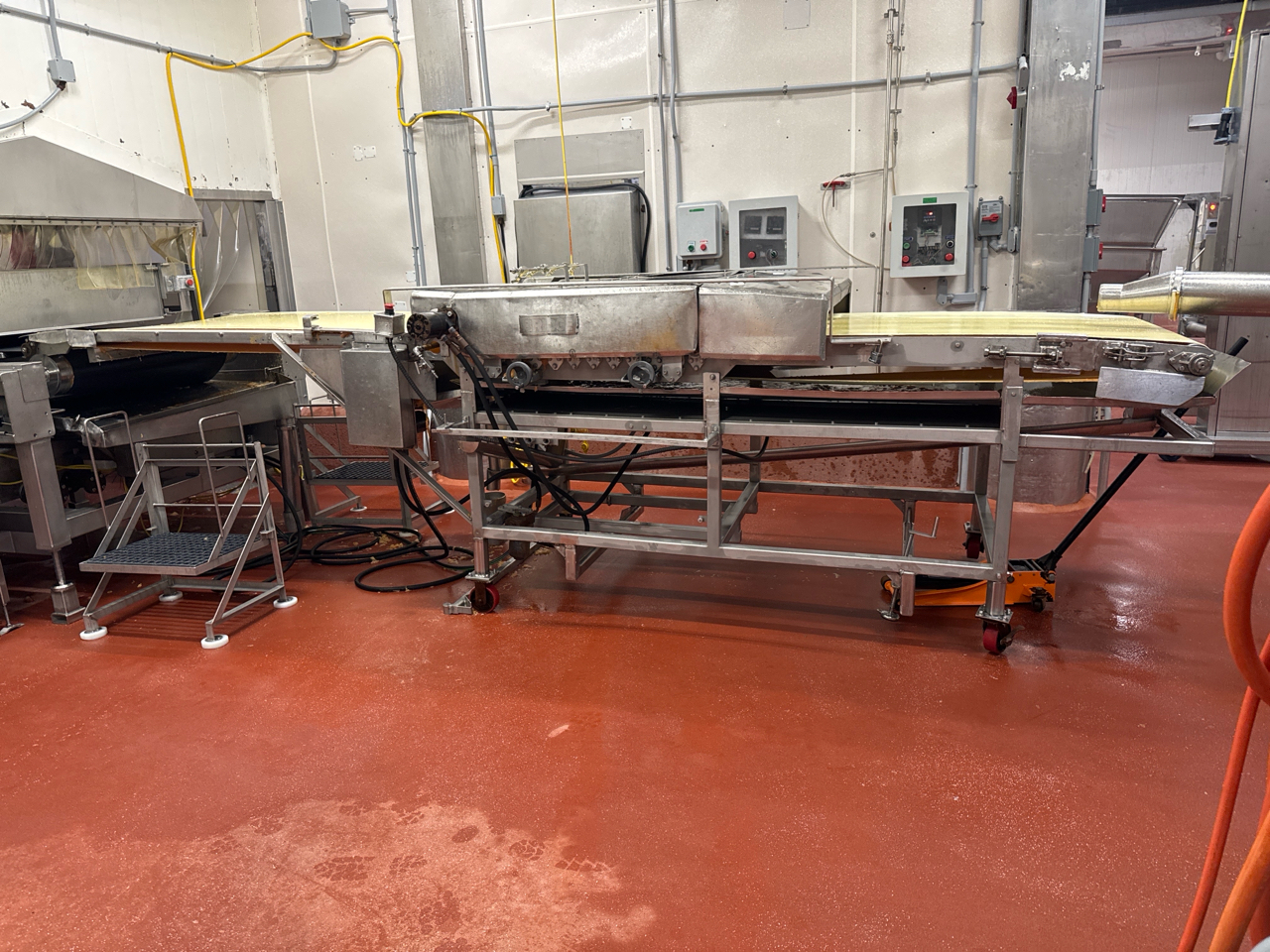 Pemburton Bridge cutlet flattening belt conveyor, ser. no. 27911-OE, stainless steel, approx. 40 in. x16 ft. w/ 60 in. top conveyor [Loc. Line 4 RAW]