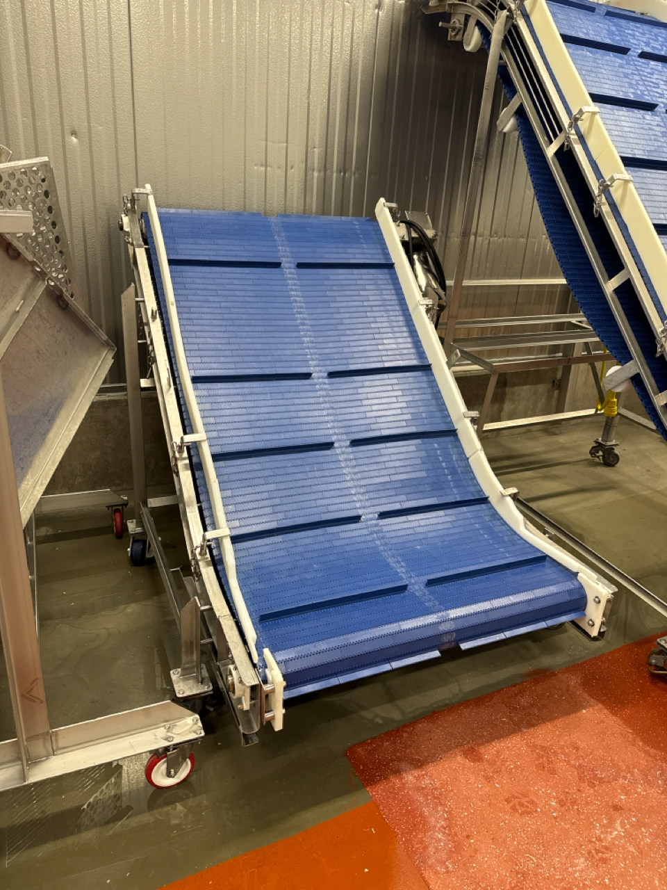 inclined fluted belt conveyor, stainless steel, approx.42 in. x 6 ft. x 5 ft. high, washdown, mobile [Loc. Line 4 RTE]