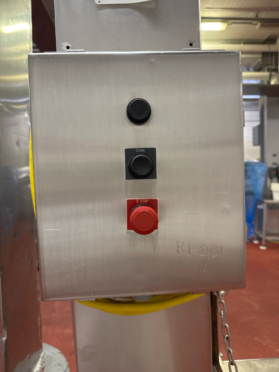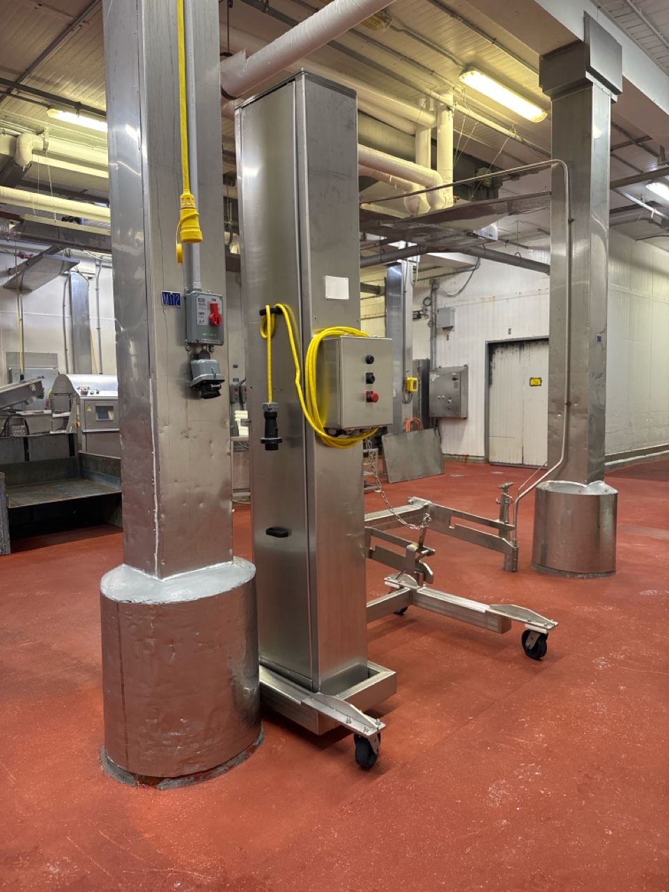 single column dumper, stainless steel, 800 lbs cap., approx. 7 ft. lift height, mobile [Loc. Production Area]