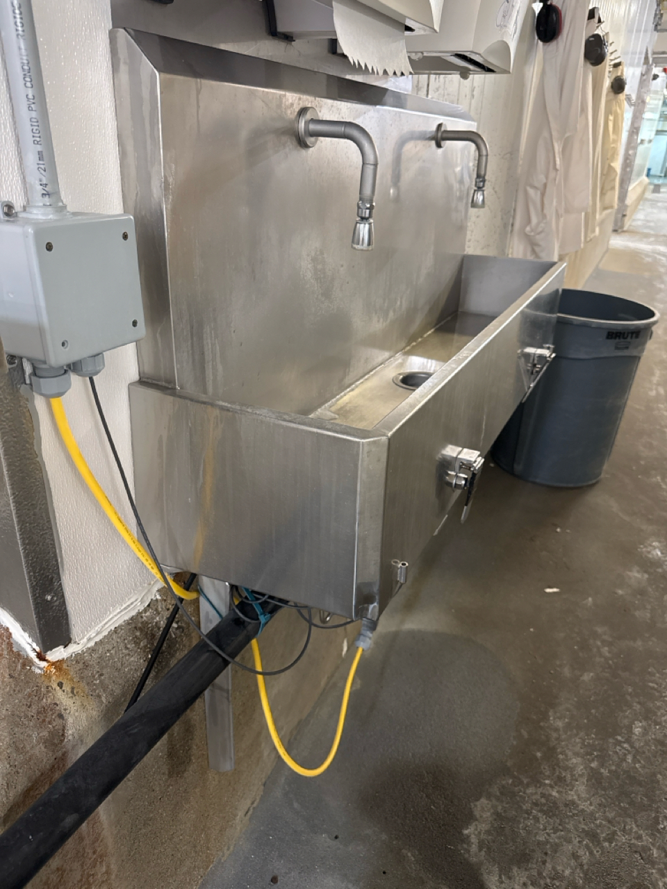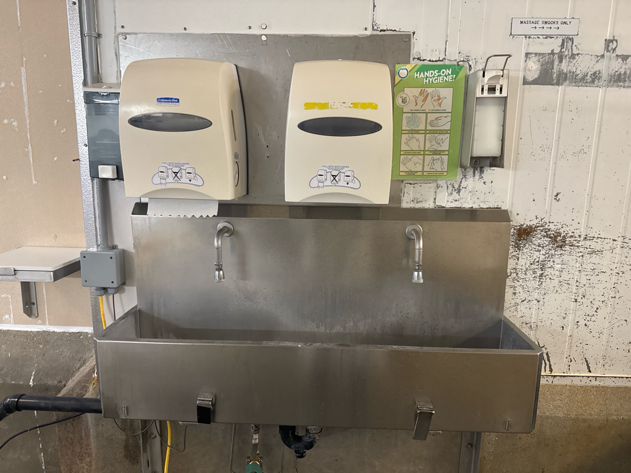 hand sink, 2-station, stainless steel, 48 in. w/ knee operated c/w (2) paper towel and (2) soap dispensers [Loc. Production Area]