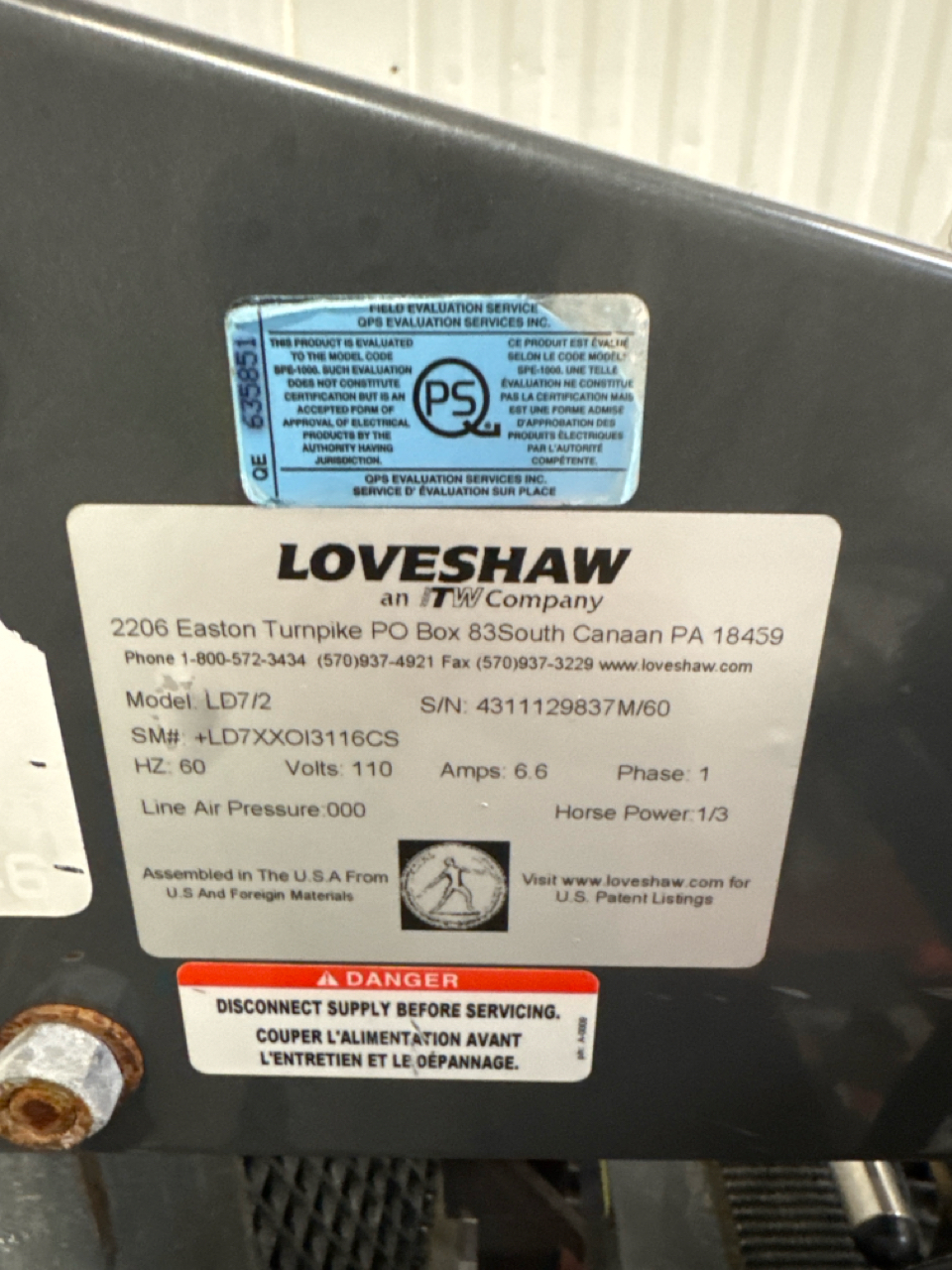 Loveshaw Little David top case sealer, mod. LD712, ser. no. 4311129837M160, 1 hp washdown [Loc. Production Area]