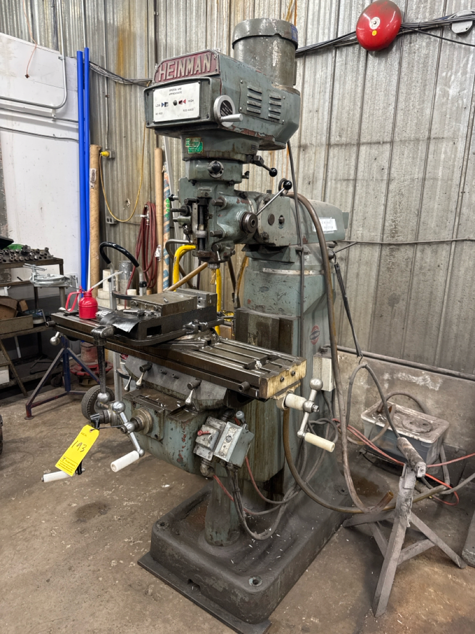 Heiman milling machine, 9 in. x 44 in. work area c/w 6 in. machine vice [Loc. Maintenance]