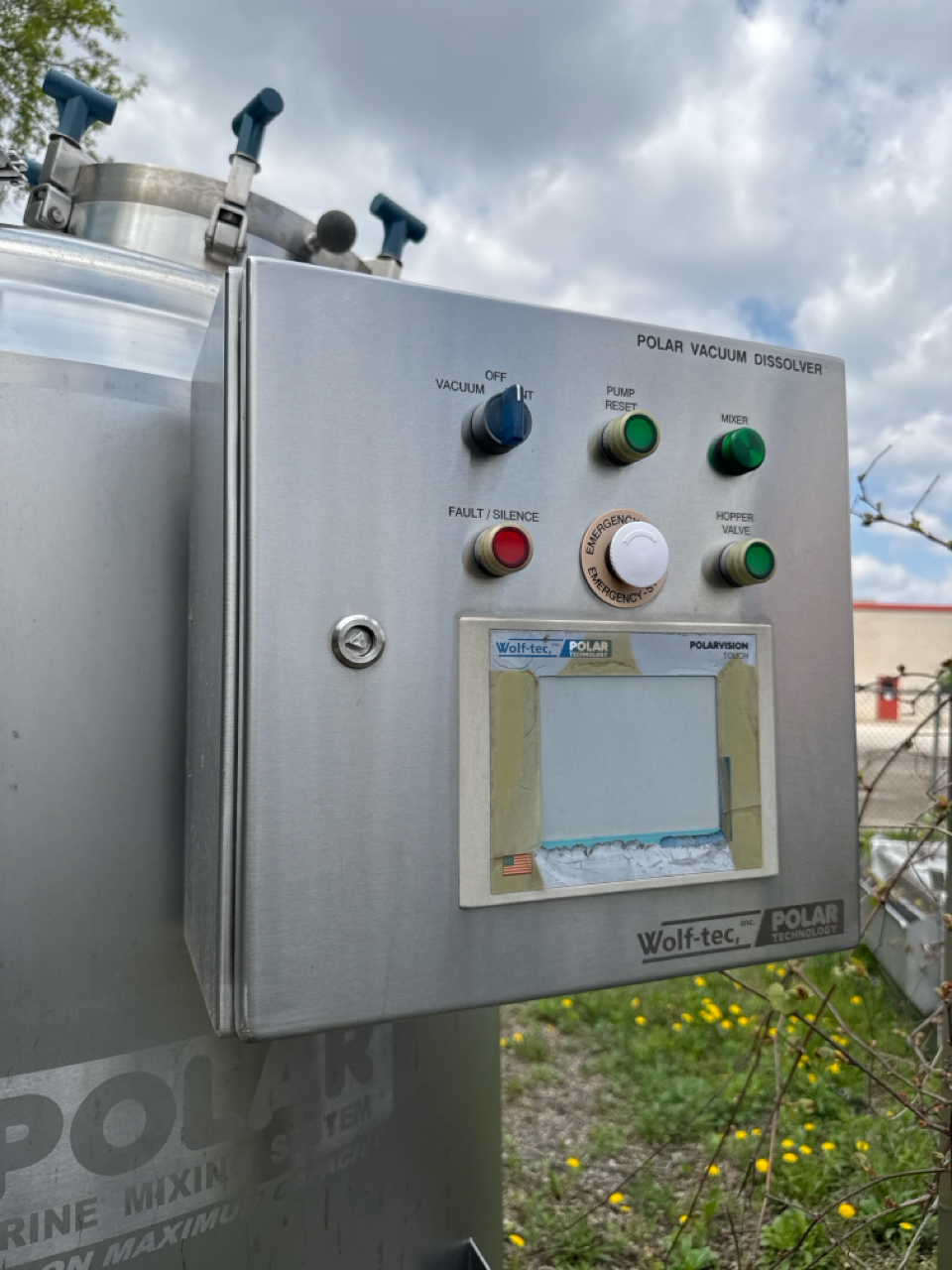 Wolf-Tec Polar brine mixing tank, stainless steel, jacketed, 25 gal. cap. w/ Polar vacuum dissolver and PolarVision controls (for parts/repair) [Loc. Bones Yard]
