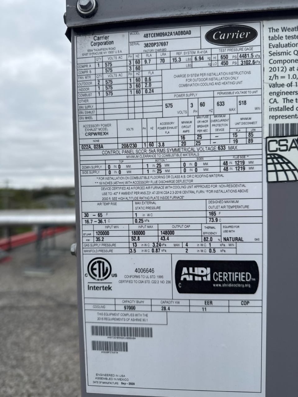 Carrier heating/cooling unit, mod. 48TCEM09A2A1A0B0A0, ser. no. 3820P37697, 148000 btu/hr. [Loc. Roof]