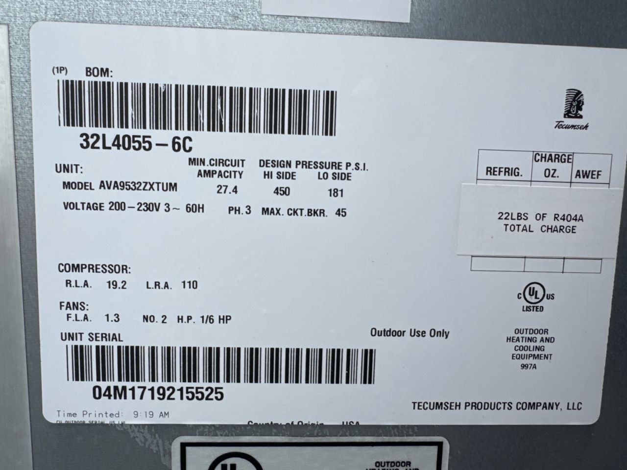 Tecumseh chiller, mod. AVA9532ZXTUM, ser. no. 32L4055-6C [Loc. Roof]