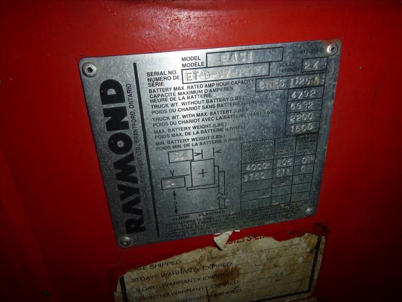 Raymond reach truck, mod. EASI, ser. no. ET-B-97-04990, 4000 lb. cap., 24V electric (charger not included) REQUIRES REPAIR