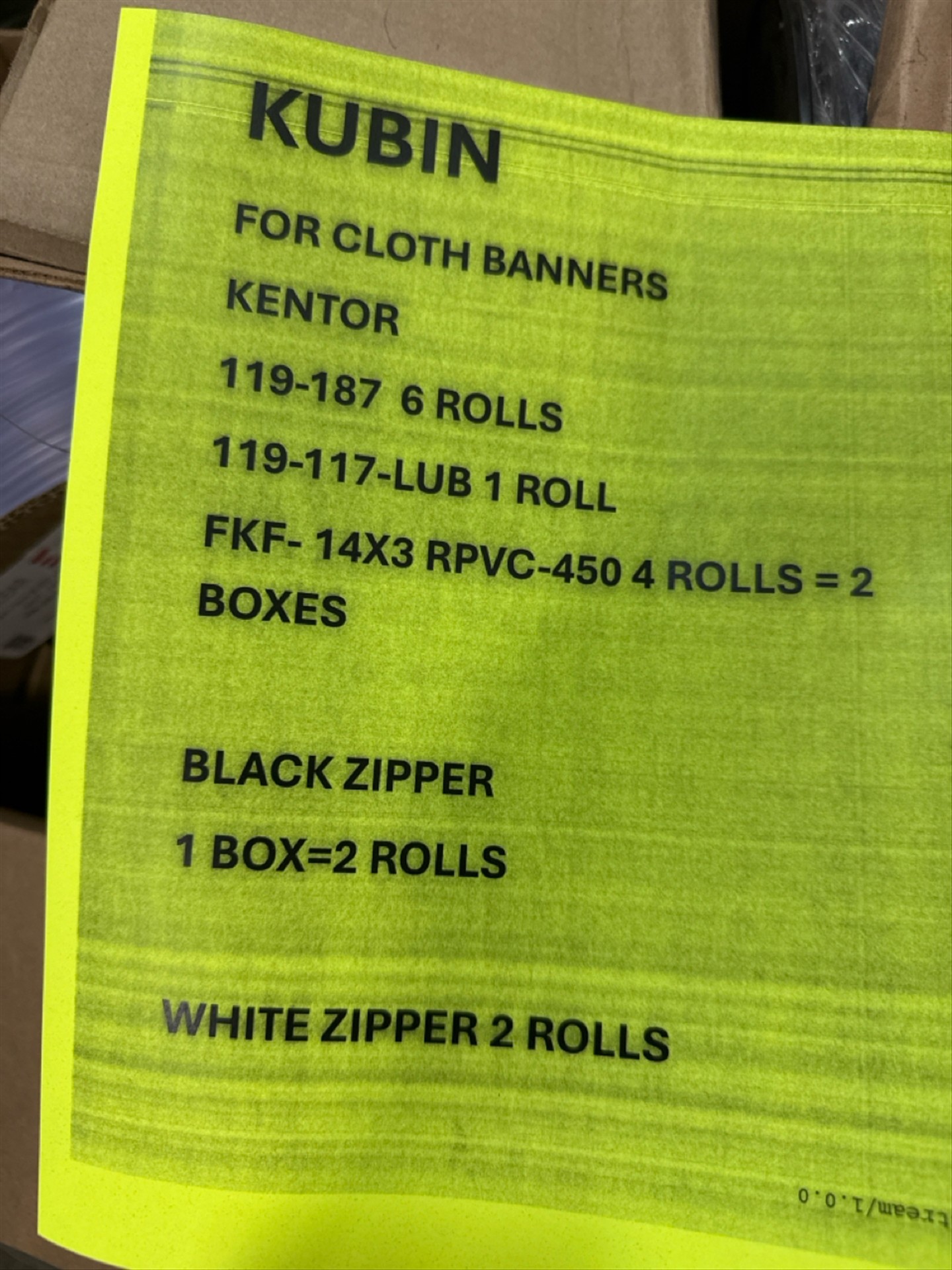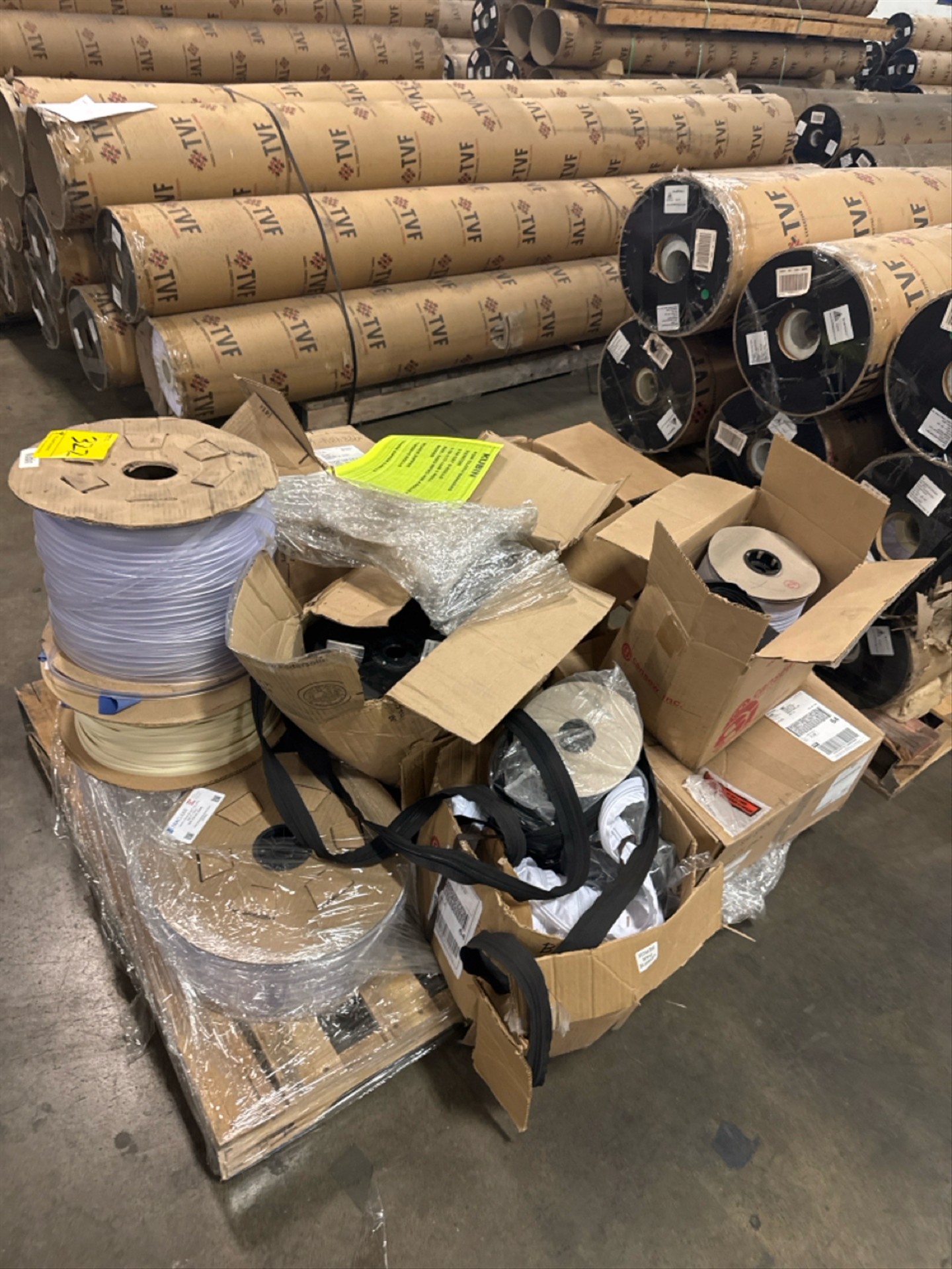(2) white zipper rolls, (2) black zipper rolls, (6) rolls of 119-187, (1) roll of 119-117, (4) rolls of FKF- 14x3 RPVC-450[Loc. Henry]