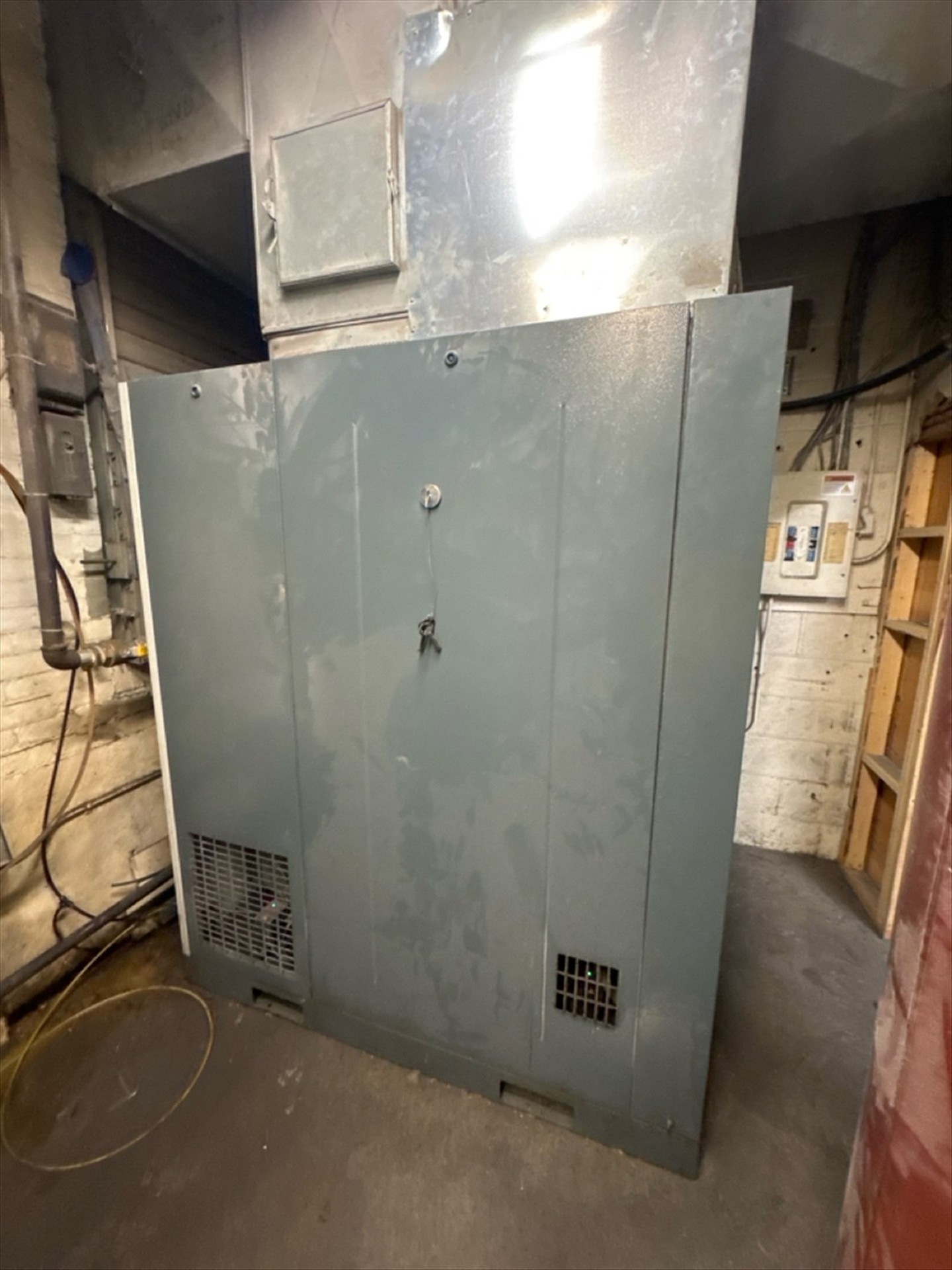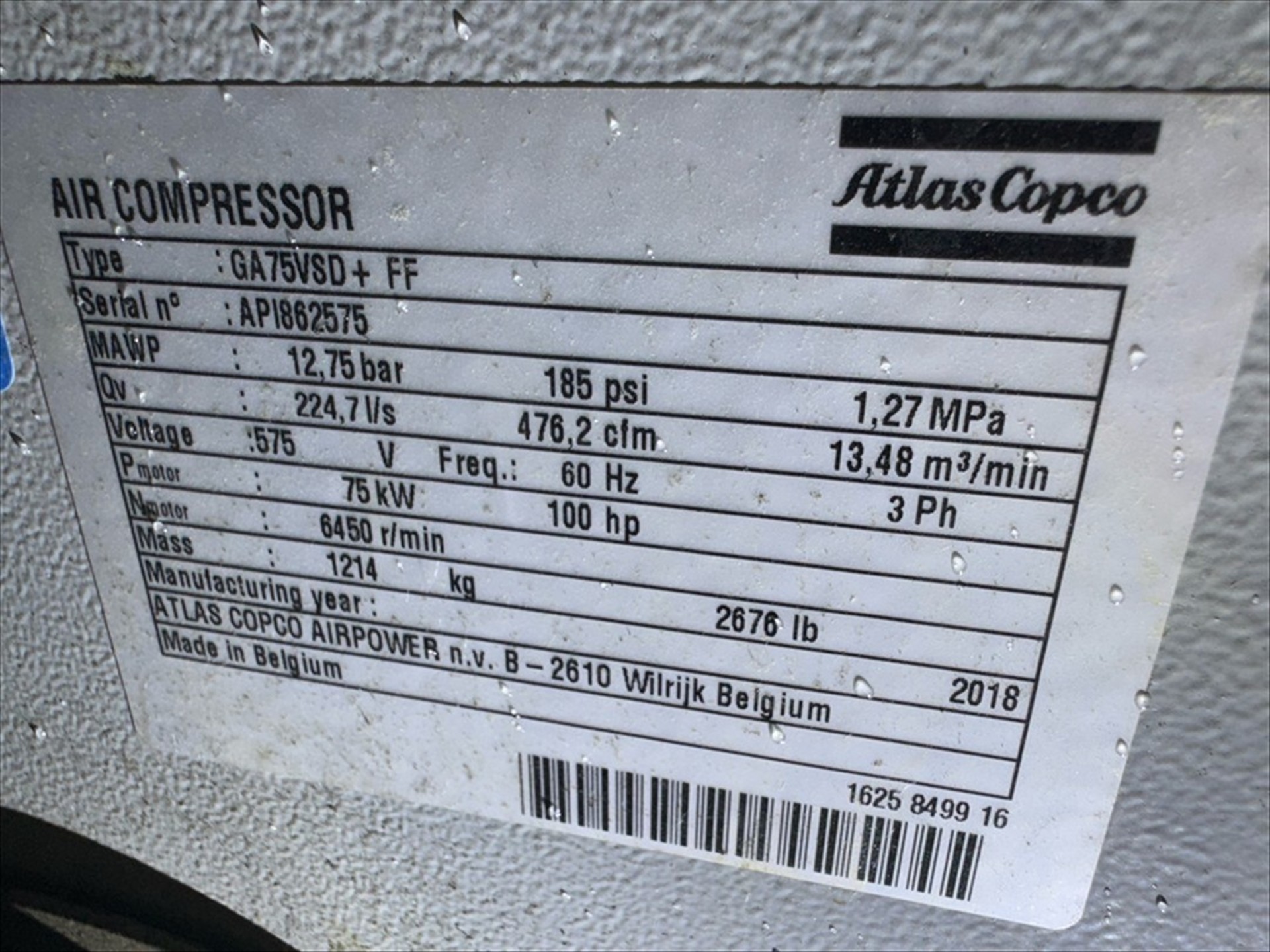Atlas Copco Mod. GA75VSD+FF Rotary Screw Air Compressor, 100-Hp, 185-Psi, W/2000 Steel Fab Inc. Vertical Air Tank, 200-Gallon Cap., 200-Psi, Ser. No. AP1862675 (2018) [Loc. Greenwich, Flr. 1]