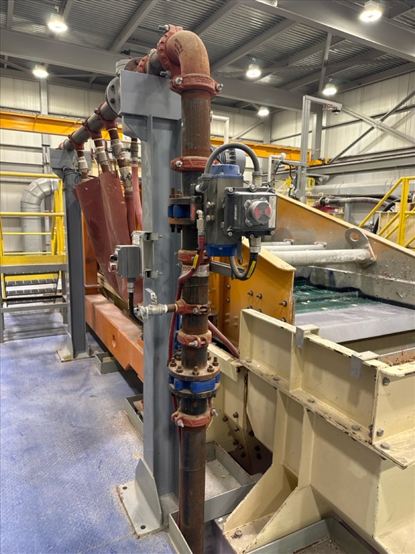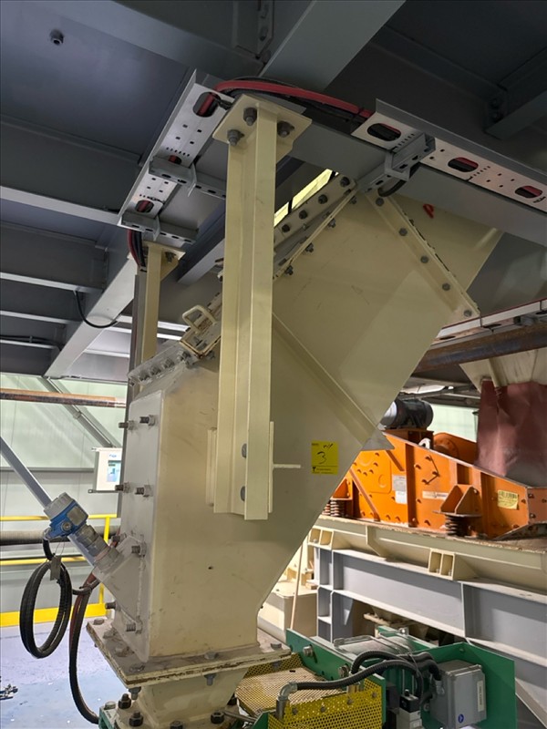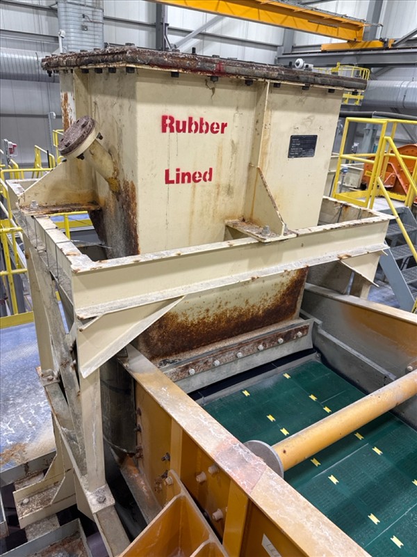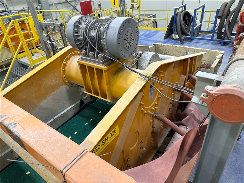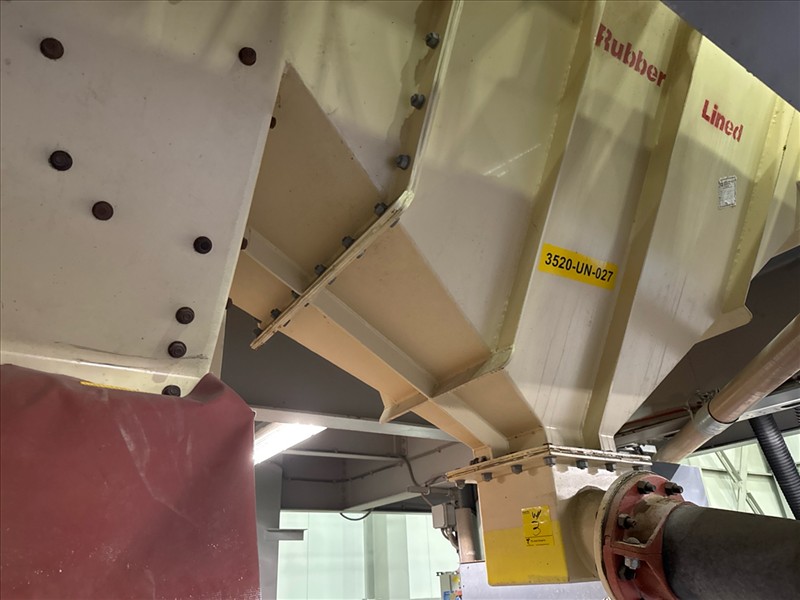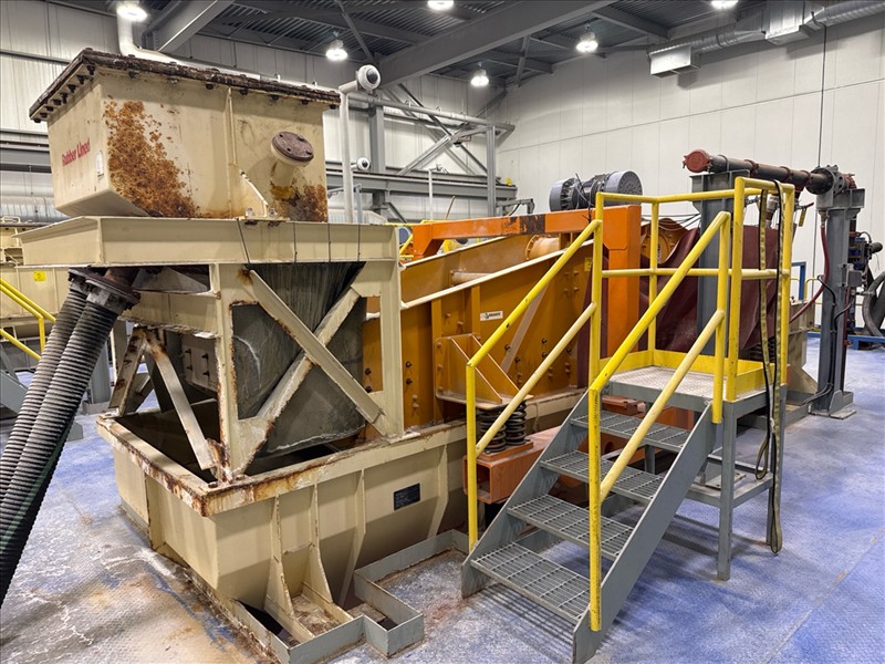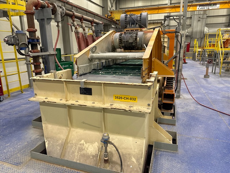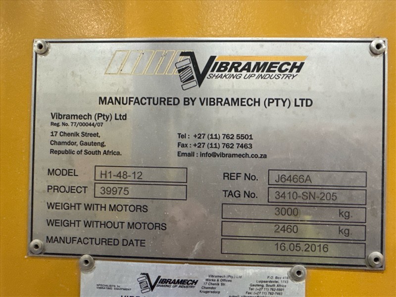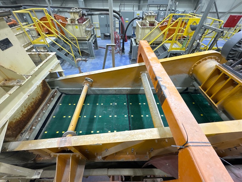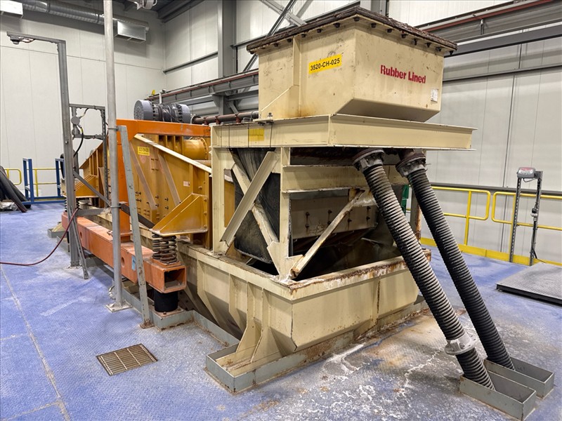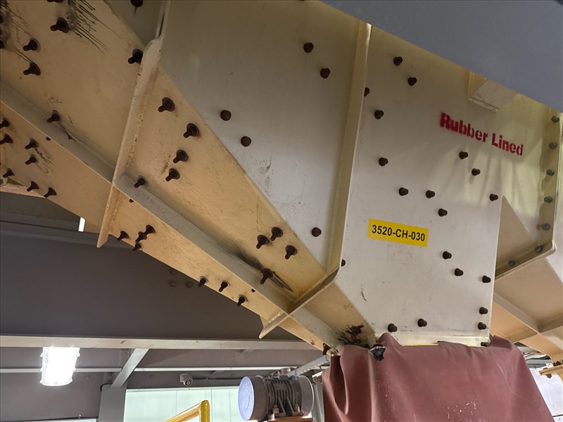 VibraMech primary vibratory sizing screen, mod. H1-48-12, ser. no. J6466A (2016), approx. 46 in. x 19 ft., (x2) 7.5 hp c/w rubber lined infeed chute, reject chute and underpan c/w work platform
