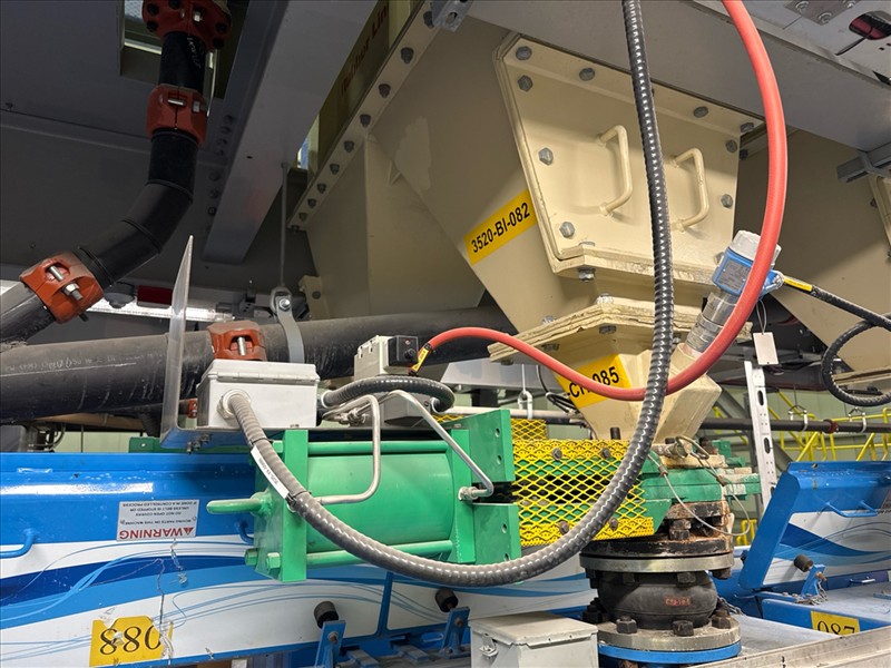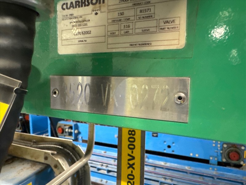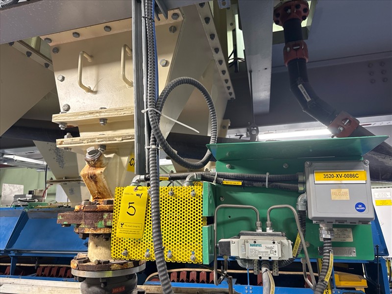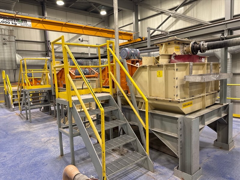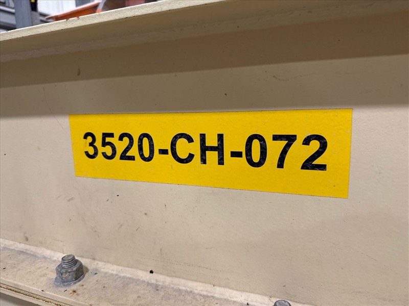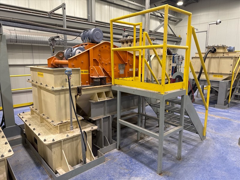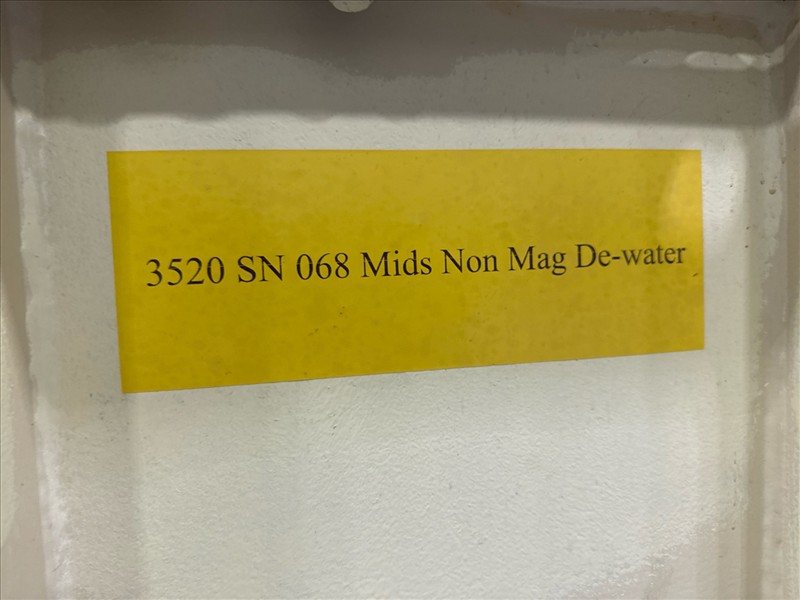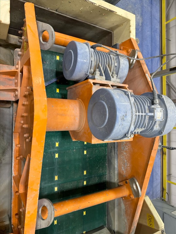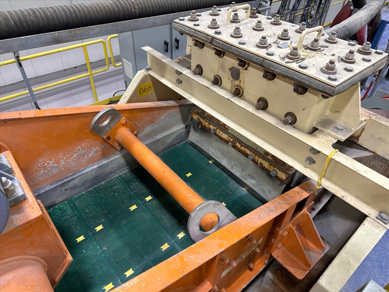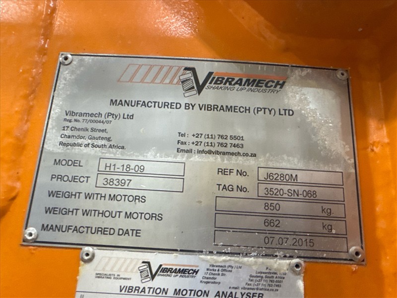 VibraMech vibratory sizing screen, 'Mids Non-Mag De-Water', mod. H1-18-09, ser. no. J6280M (2015), approx. 34 in. x 90 in., (x2) 1/2 hp c/w 6 mm rubber lined infeed chute, reject chute and underpan c/w work platform