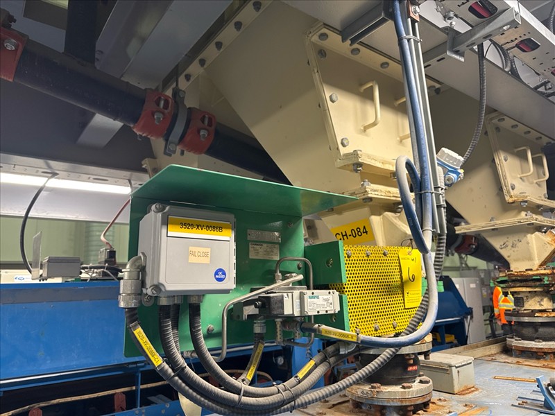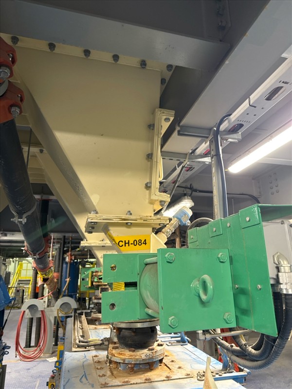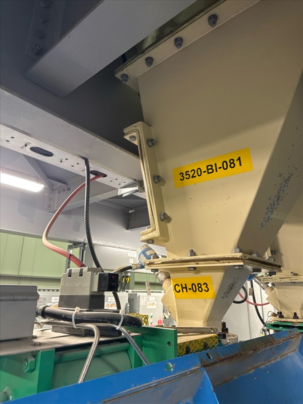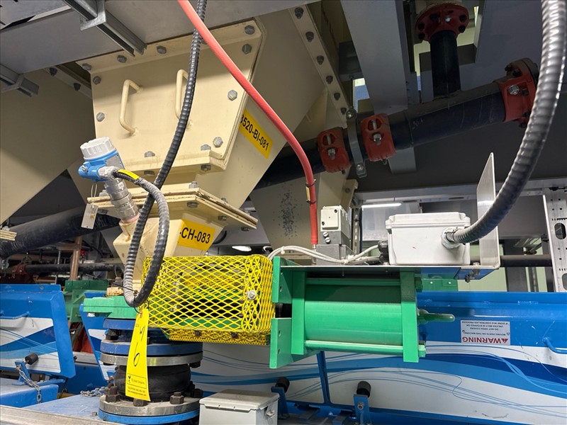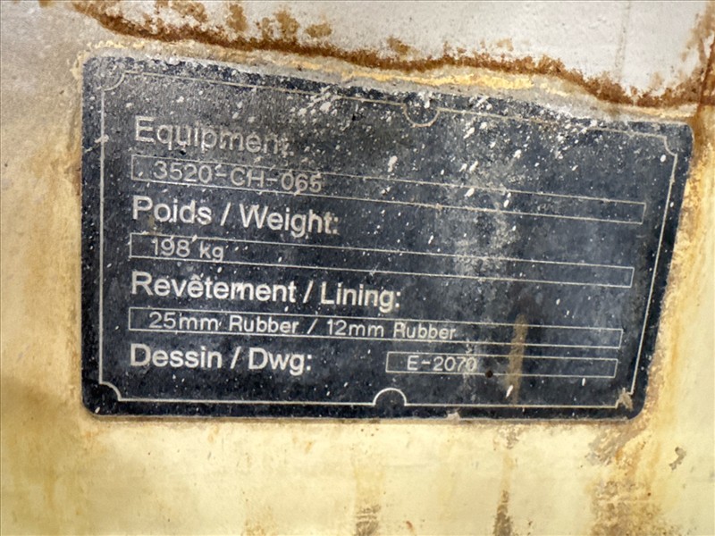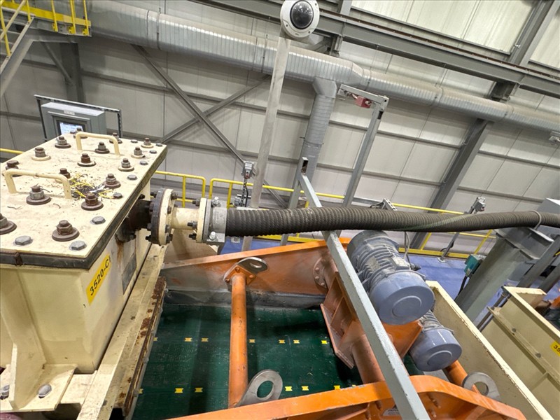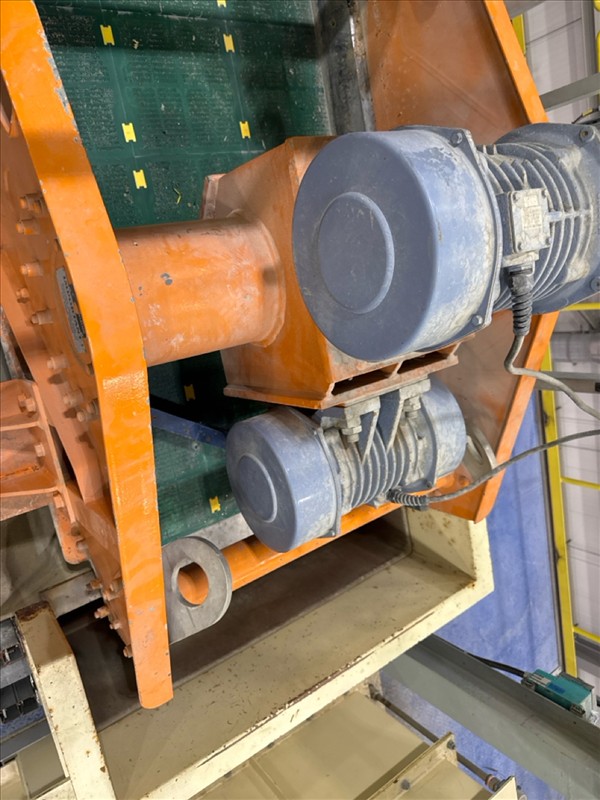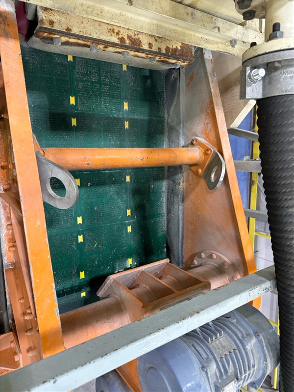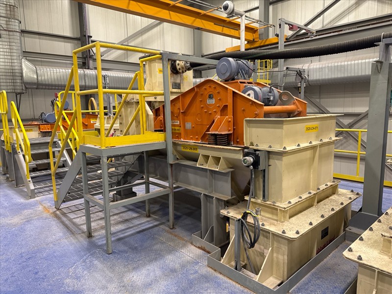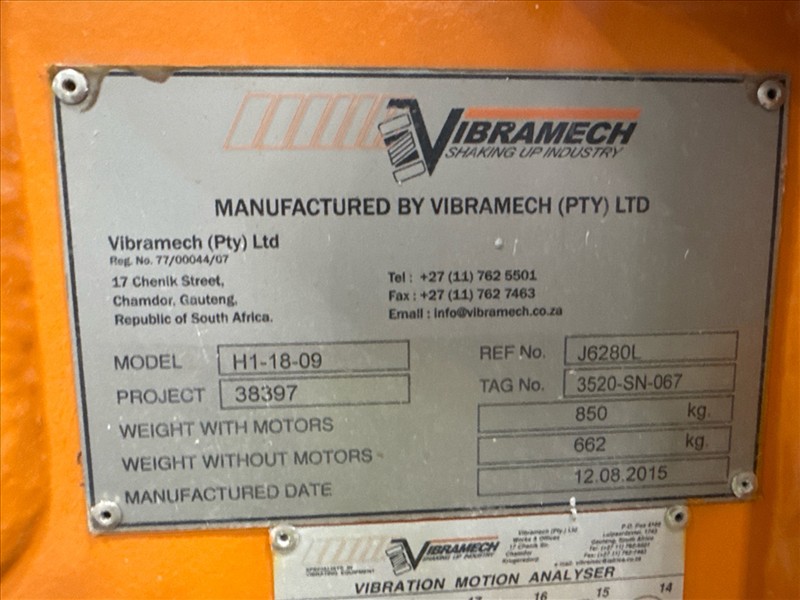 VibraMech vibratory sizing screen, 'Fines Non-Mag De-Watering', mod. H1-18-09, ser. no. J6280L (2015), approx. 34 in. x 90 in., (x2) 1/2 hp c/w 6 mm rubber lined infeed chute, reject chute and underpan c/w work platform