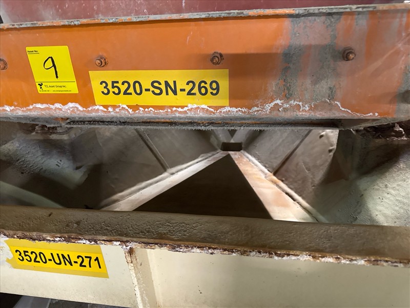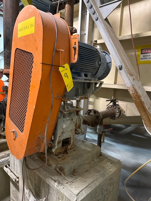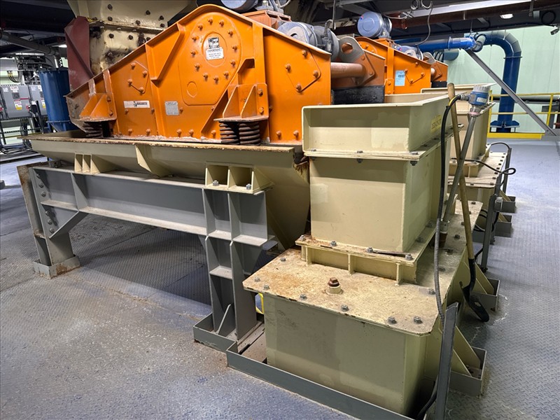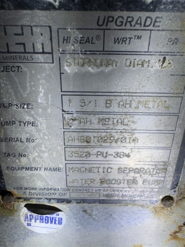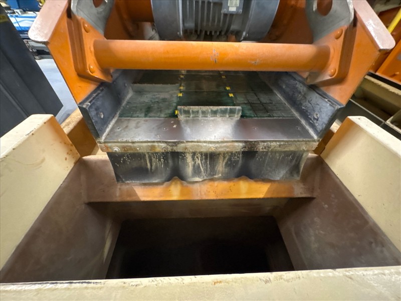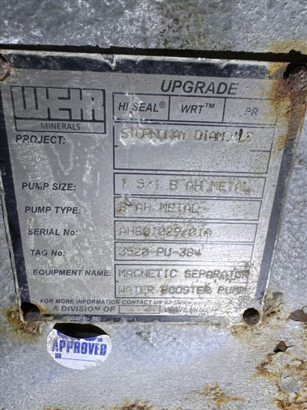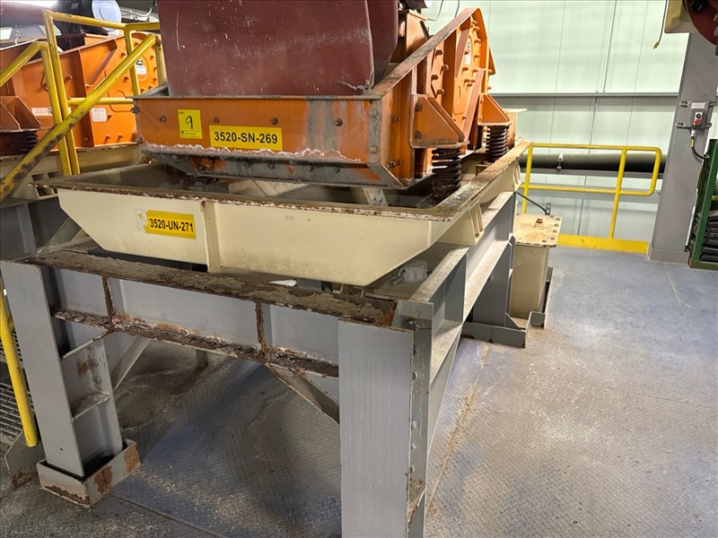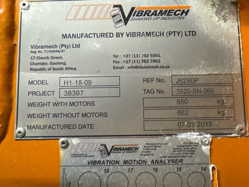 VibraMech vibratory sizing screen, 'Fines Non-Mag De-Watering', mod. H1-18-09, ser. no. J6280P (2015), approx. 34 in. x 90 in., (x2) 1/2 hp c/w 6 mm rubber lined infeed chute, reject chute and underpan c/w Warmand centrifugal pump, 20 hp