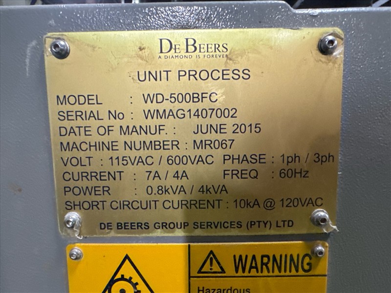 DeBeers 'Fines No. 2 Prim' magnetic separator, mod. WD-500BFC, ser. no. WMAG1407002 (2015), 1.5 hp c/w DeBeers pneumatic/water cooling panel