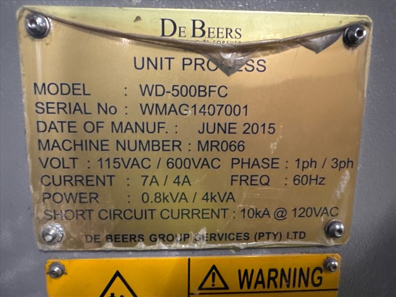 DeBeers 'Fines No. 1 Prim' magnetic separator, mod. WD-500BFC, ser. no. WMAG1407001 (2015), 1.5 hp c/w DeBeers pneumatic/water cooling panel