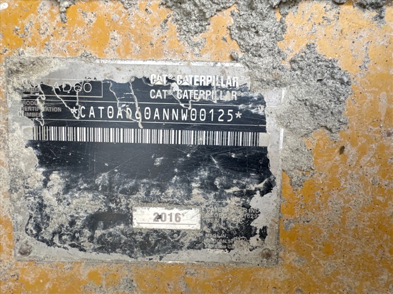 Caterpillar (CAT) underground articulated haul truck, mod. AD60, ser. no. CAT0AD60ANNW00125 (2016), 60-ton cap., CAT Acert eng., approx. 27777 hrs. (requires repair - cracked block) [Loc. Garage Hilltop Pad]