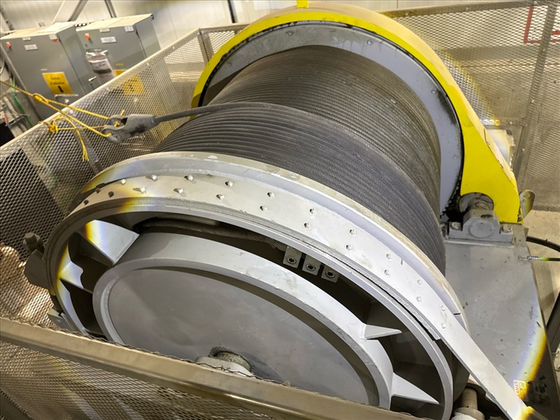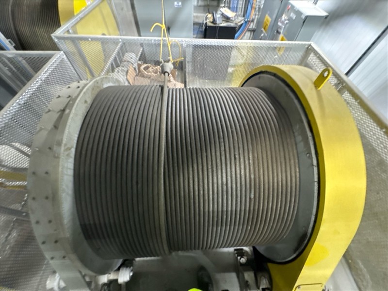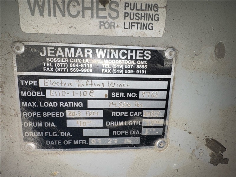 Jeamar electric lifting winch, mod. E110-1-10E, ser. no. 9768 (2016), 10 hp 40 in dia. X 55 in. drum, 1 in. rope, 14500 lbs./20.3 ft./min./3437 ft. cap. c/w starter and transformer [Loc. FAR]
