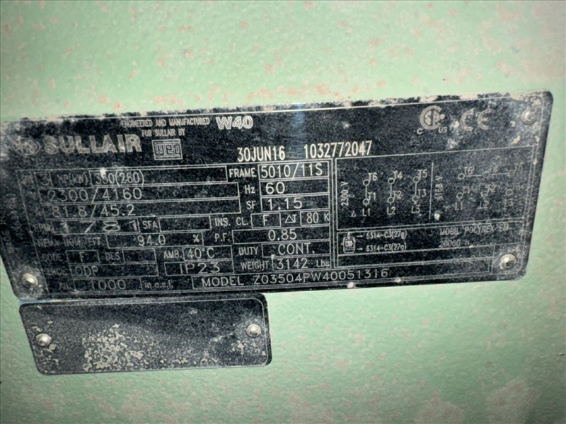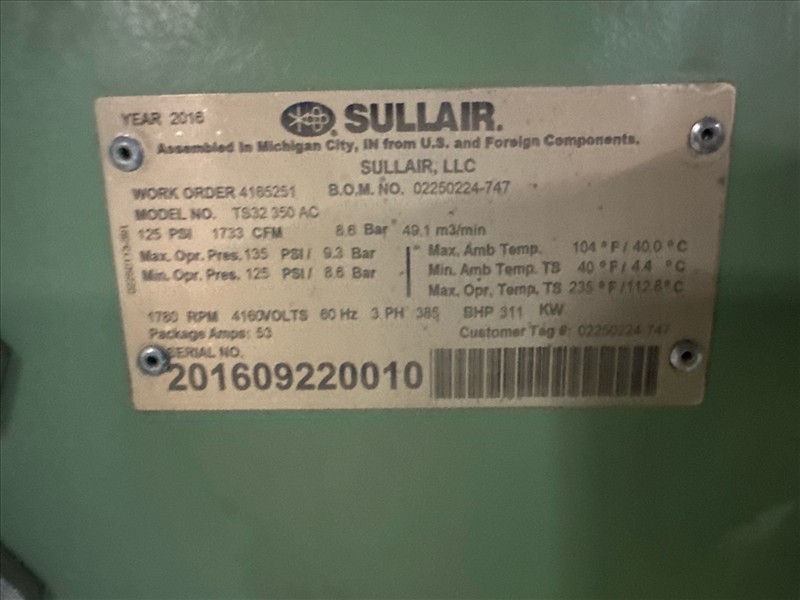 Sullair air compressor, mod. TS32-350-AC, ser. no. 201609220010 (2016), 350 hp, 124 psi, 1733 cfm, approx. 26083 hrs. w/ integrated air receiver, pallet mounted [Loc. FAR]