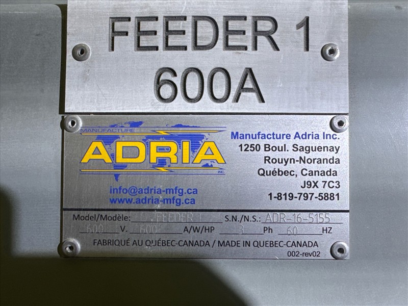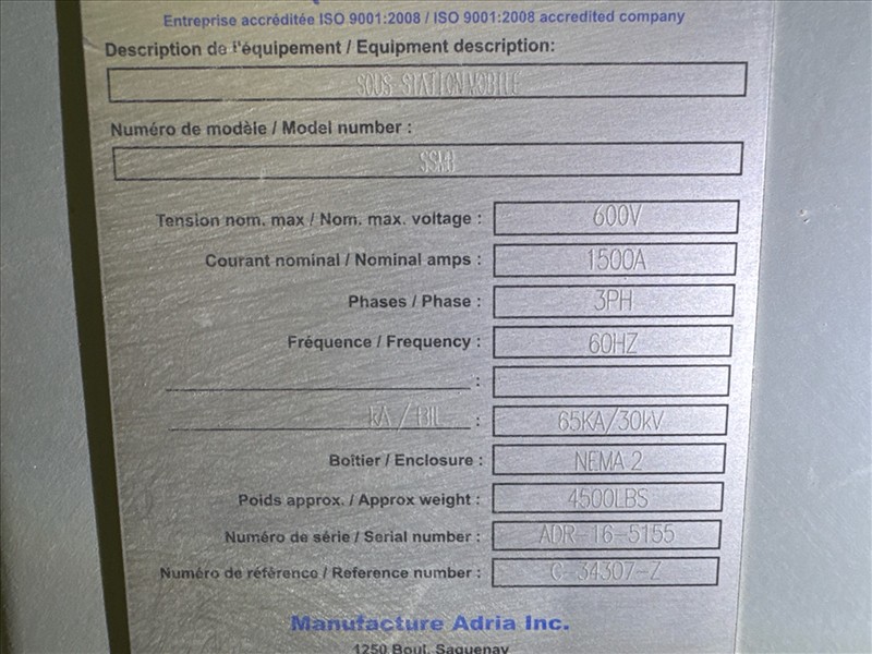 Adria portable sub-station, mod. SSMB, ser. no. ADR-16-5155, 600V, 1500A, 60 hz, 3 ph, 60 ka, 30 kv [Loc. Garage, Door No. 7]
