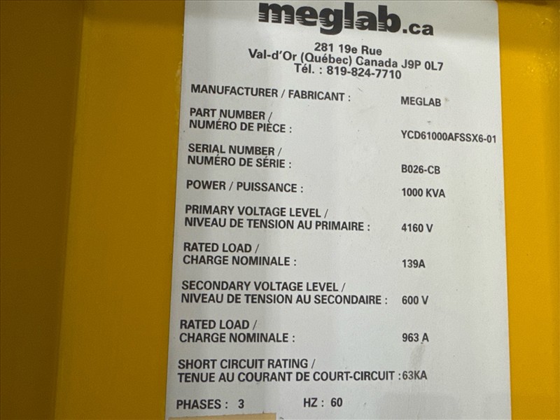 MegaLab transformer, mod. YCD61500AFSXX9-01, ser. no. AA17-01, 1500 kva, 600V/4160V, 209A/1444A, 60 hz, 3 ph, 63 ka [Loc. Garage, Door No. 7]