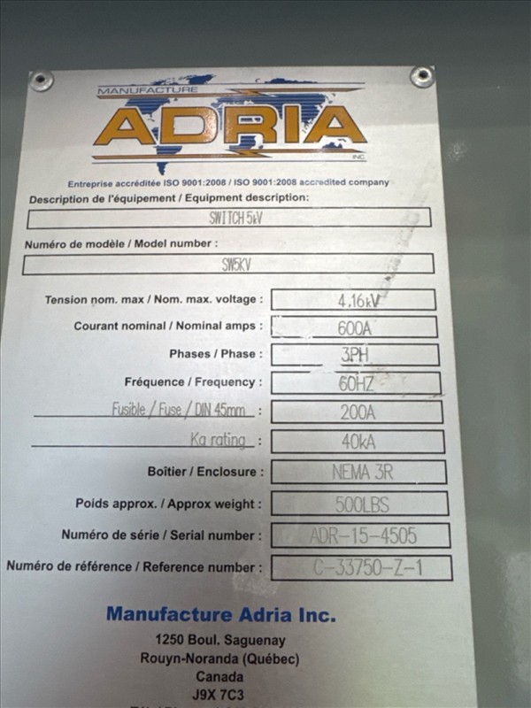 Adria single switchgear, mod. SW5KV, ser. no. ADR-15-4505, 4160V, 200A/600A, 60 hz, 3 ph, 40 ka [Loc. Garage, Door No. 7]