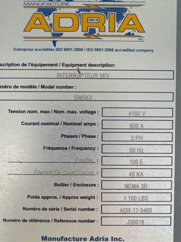 Adria single switchgear, mod. SW5KV, ser. no. ADR-17-5460, 4160V, 200A/600A, 60 hz, 3 ph, 40 ka [Loc. Garage, Door No. 7]