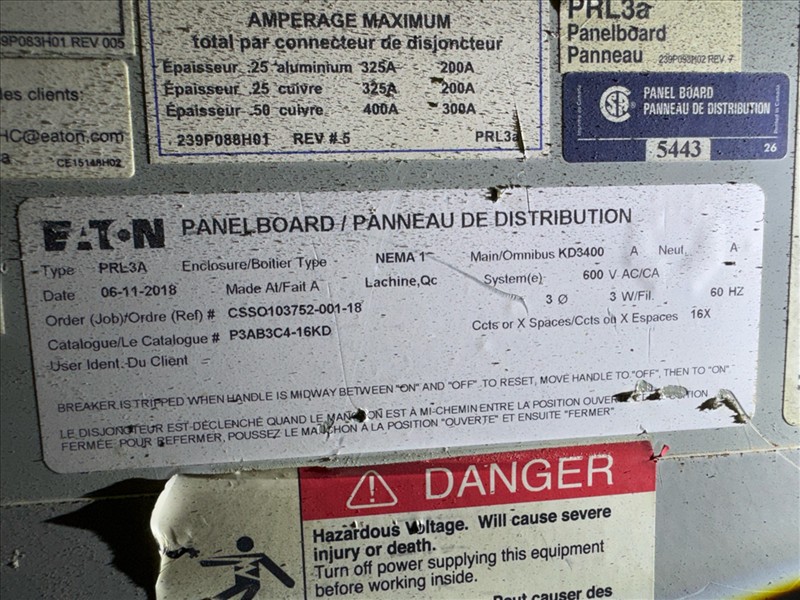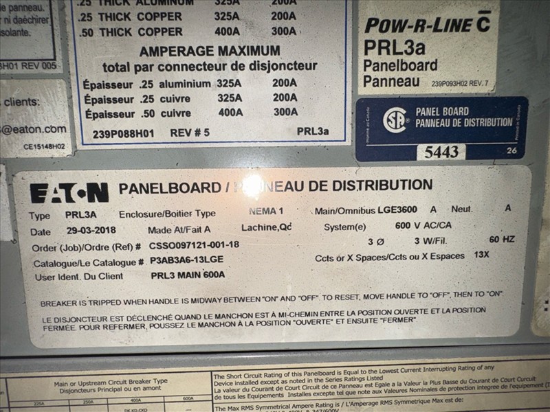 (2) MegaLab distribution panels, mod. PTO6T200DS12XL-02, ser. no.'s B026-F3 and B032-C5, 600V, 600A, 60 hz, 3 ph [Loc. Blue Zone, Level M]