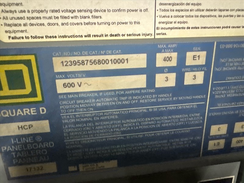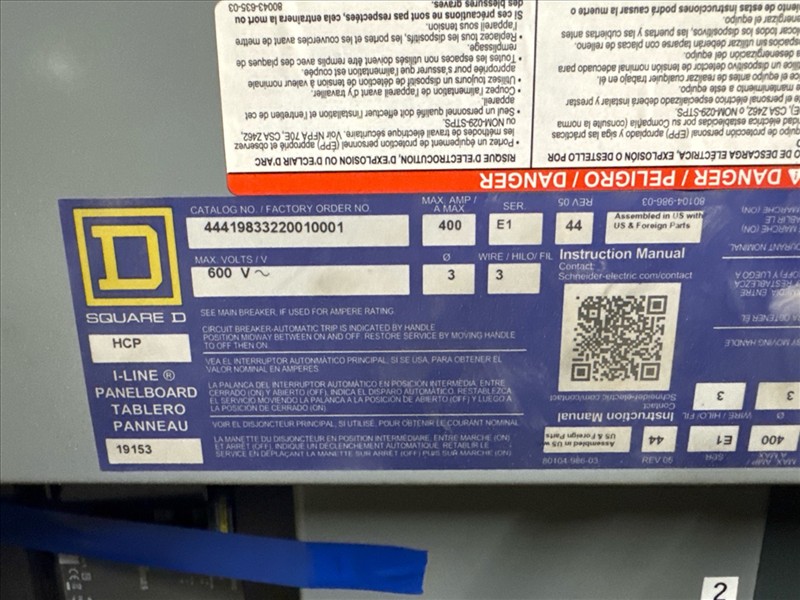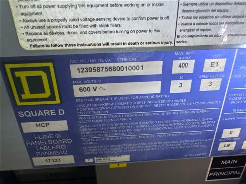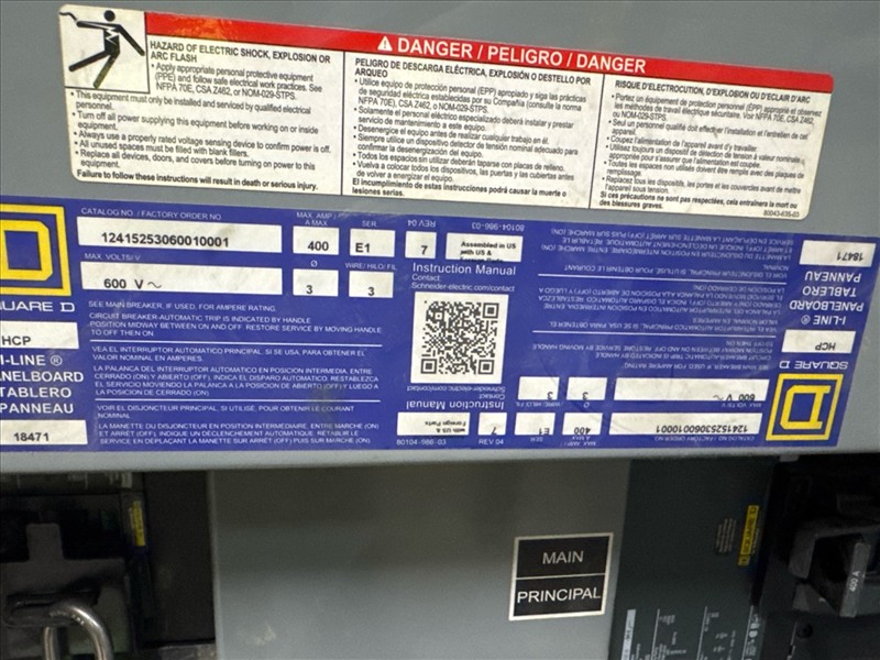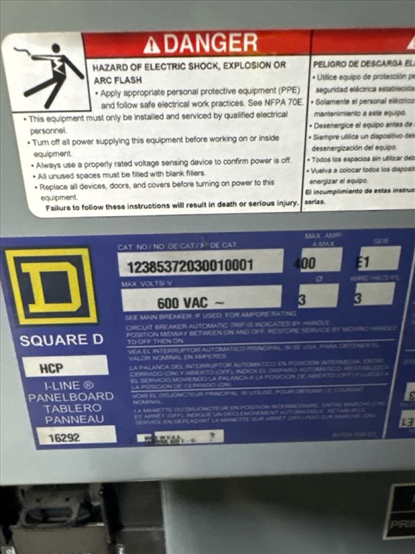(5) MegaLab SQD distribution panels, 600 VAC, 400A, 3 ph, 3 w [Loc. Blue Zone, Level M]