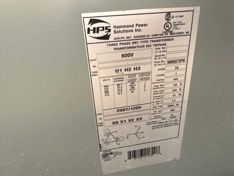 (2) Hammond transformers, 75 kva ea. [Loc. Blue Zone, Level M]