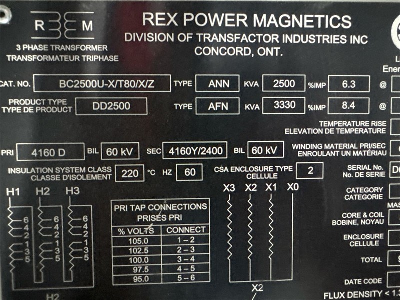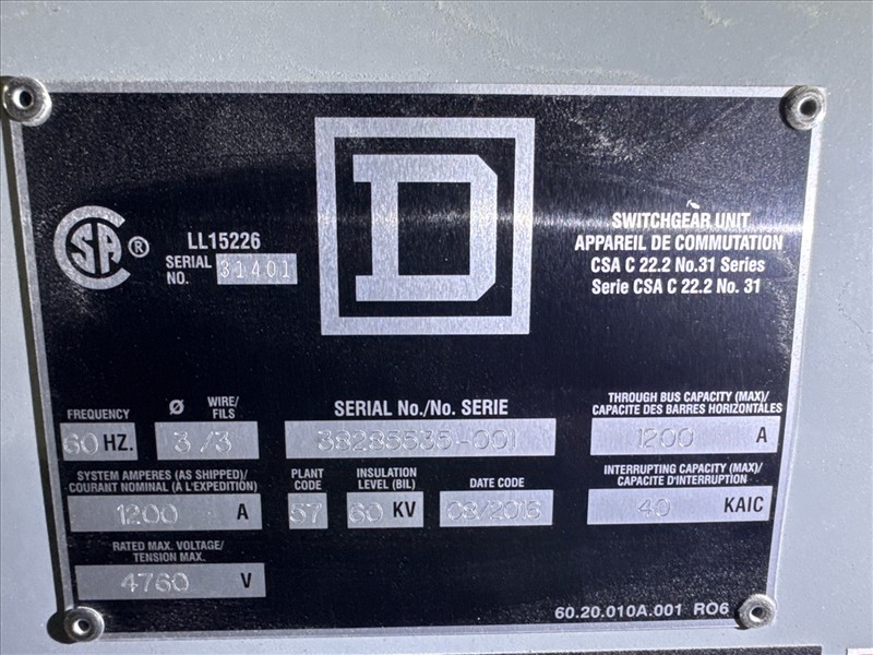 Rex transformer, mod. BC2500U-X/T80/X/Z, ser. no. 2261-TXM-0001, 2500 kva, 4160V, 416Y/2400A, 60 kv w/ Square D MasterClad switchgear, ser. no. 38285535-001 (2016), 4760V, 1200A, 60 hz, 3W, 60 kv, 40 kiac w/ Vamp321 control [Loc. FAR]