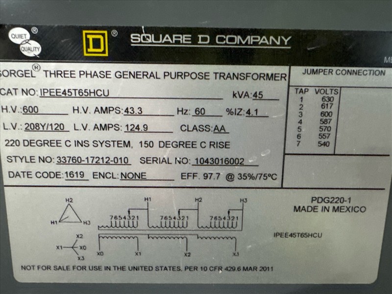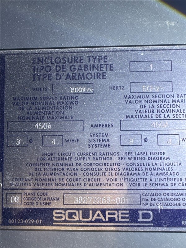 Square D integrated power center, 600V, 450A, 60 hz, 3 ph w/ Square D transformer, 45 kva, 600V, 43.3A/124.9A, 60 hz [Loc. FAR]