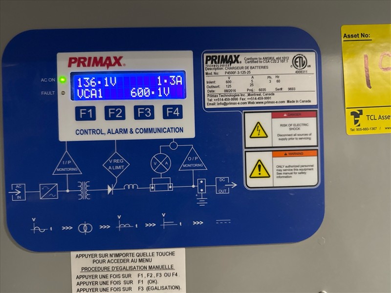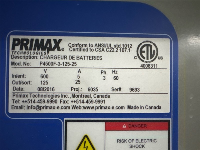Primax battery charger, mod. P4500F-3-125-25, 125V/600V, 5A/25A, 60 hz, 3 ph [Loc. FAR]