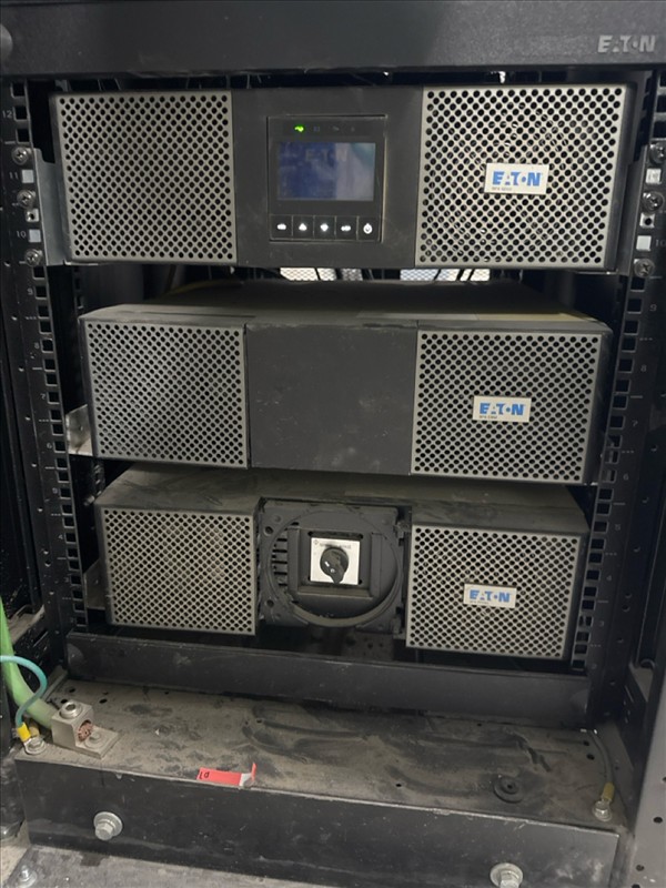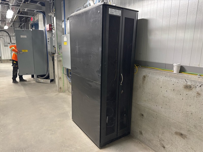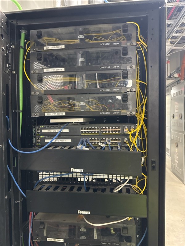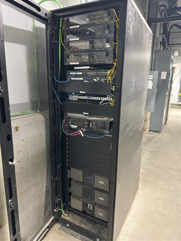 Telecom cabinet/server rack w/ (5) Corning lanscape and (2) Panduit servers, etc. [Loc. FAR]