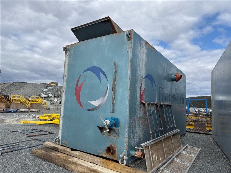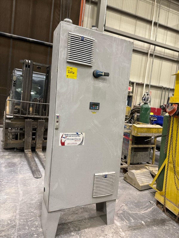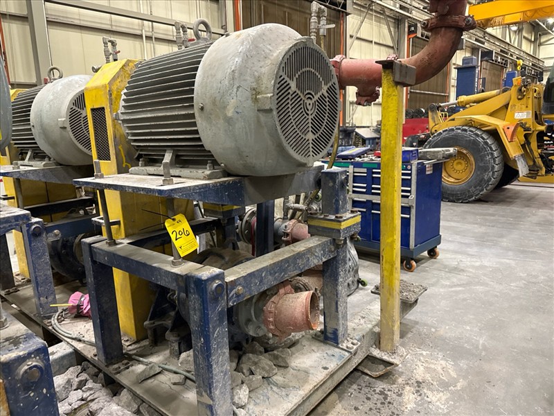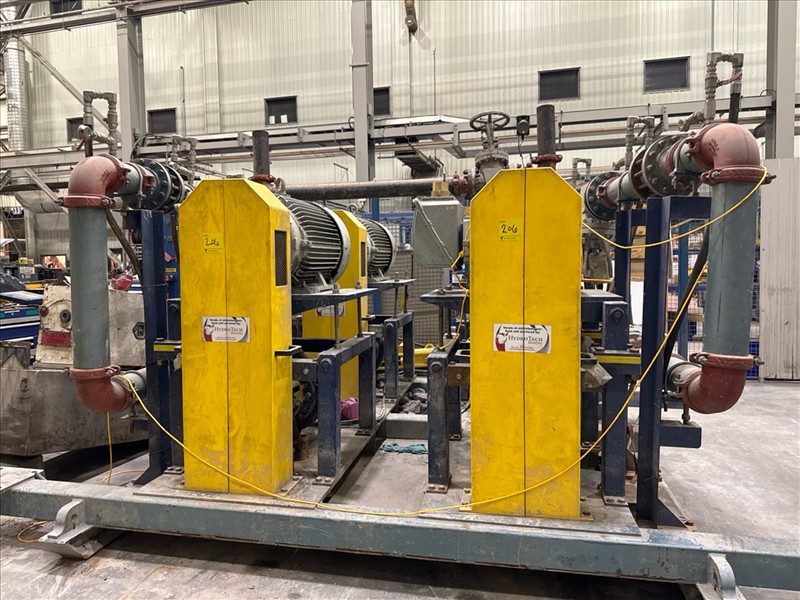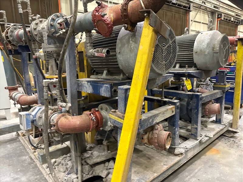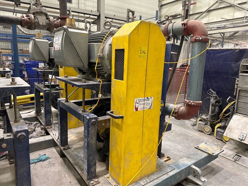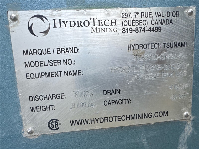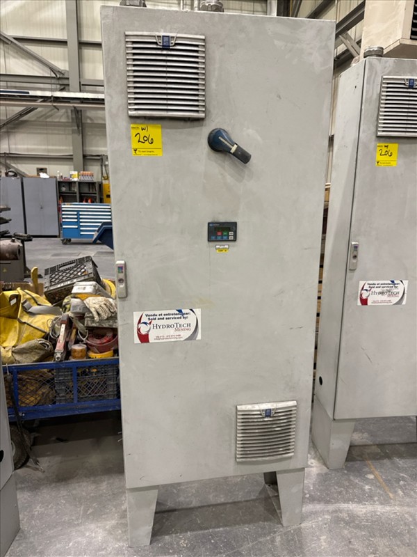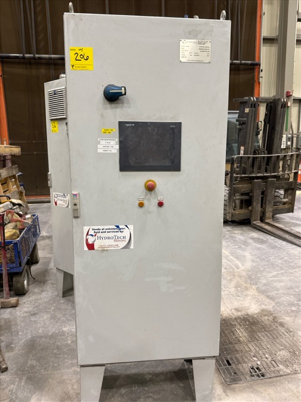 HydroTech pump pallet, incl.: (4) Warman centrifugal pumps, 200 hp ea. c/w (4) HydroTech/Benshaw drives, 200 hp ea., 600V and HydroTech touch screen control panel/PLC, mod Quadruplex 200hp 575V, ser. no. ELE-36994-OPP21-089, 600hp, 575V, 768, 60 hz, 3 ph (2nd Loc. Garage) c/w 30 cu. m. tank (3rd Loc. Red Line Pad) [Loc. Portal Pad]