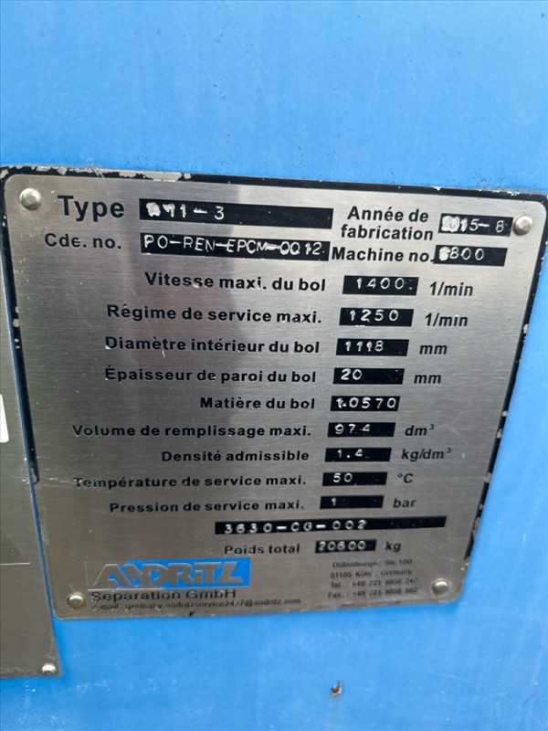 ANDRitz decanter centrifuge, mod. A11-3, ser. no. 6800 (2015) c/w 2 hp hydraulic pack [Loc. UTEM Pad]